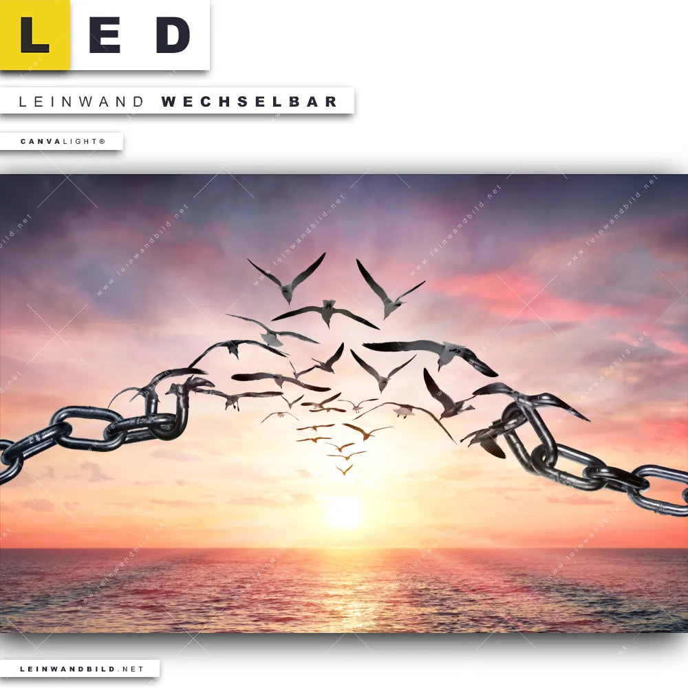 Du bist auf der Suche nach einem Landschaften, Strand - Meer, Tierwelt LED Leinwandbild im Querformat? Begriffe wie Meer, Sonnenuntergang, Vogel, Freiheit, Möwe, Kette, Reise haben Dich auf der Suche nach Deinem neuen XXL LED Wandbild mit wechselbarer Leinwand inspiriert? Farben wie Orange, Rot, Lila dürfen auf Deinem neuen breiten Leinwand-LED-Bild nicht fehlen und Leuchtbilder im Modern Art, Surreal - Fantasy Stil passen perfekt zu Deinem Einrichtungsstil?