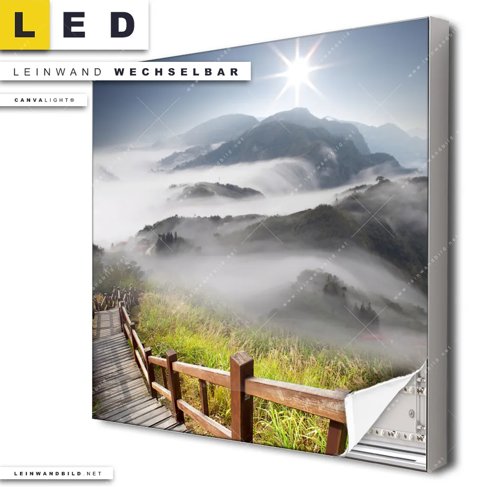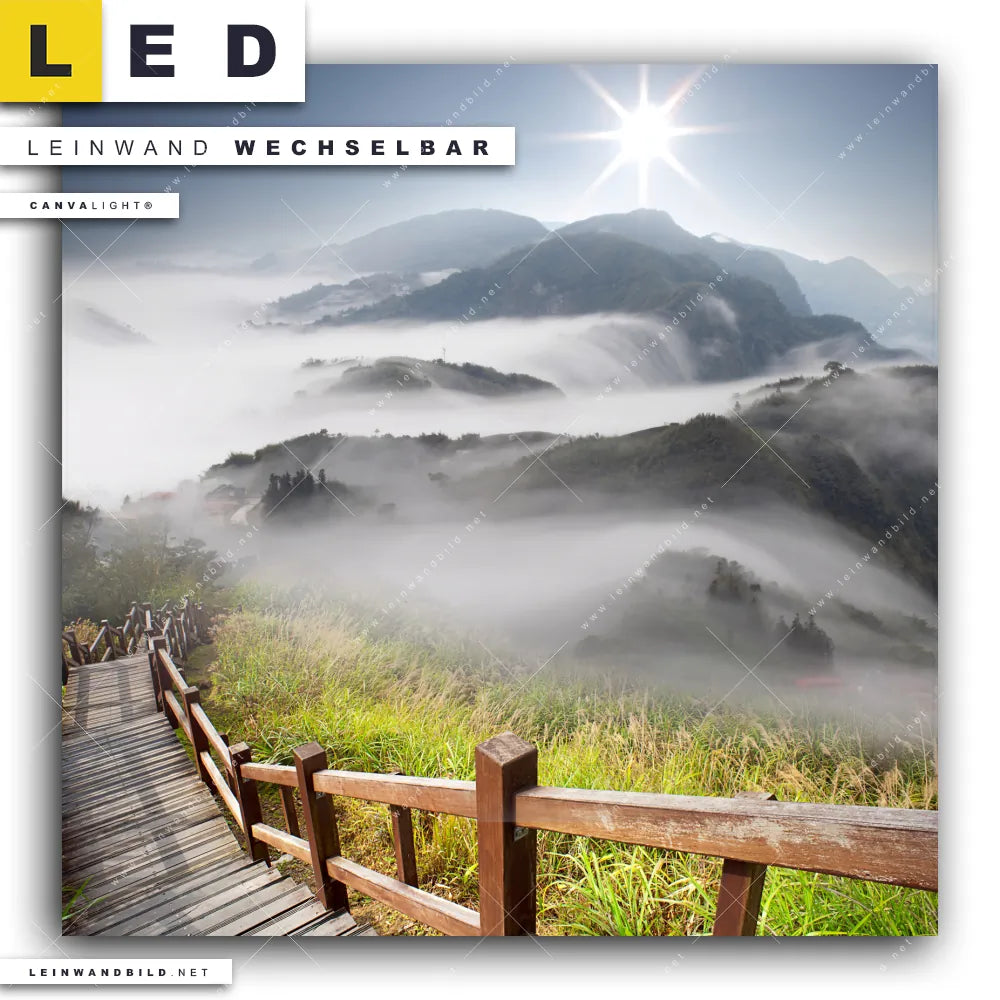 Du bist auf der Suche nach einem Landschaften LED Leinwandbild im Quadratischen Format? Begriffe wie Wanderlust, Berg, Holztreppe, Nebel, Wolken, Sonne, Sonnenaufgang, Wandern, Natur, Landschaft haben Dich auf der Suche nach Deinem neuen XXL LED Wandbild mit wechselbarer Leinwand inspiriert? Farben wie Blau, Braun, Weiss, Grün dürfen auf Deinem neuen Leinwand-LED-Bild nicht fehlen und Leuchtbilder im Natürlich - Realistisch Stil passen perfekt zu Deinem Einrichtungsstil?