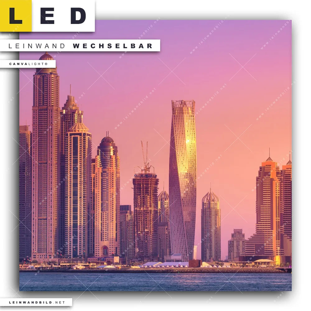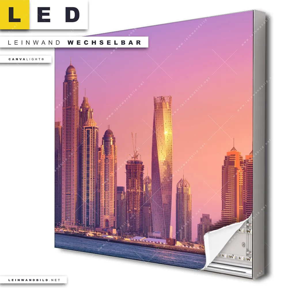 Du konfigurierst Dein individuelles LED Leinwandbild Canvalight® TEX | Sonnenaufgang in Dubai | Quadrat und wir produzieren es NEU für Dich. Unsere Architektur - Gebäude, Städte - Skylines LED Bilder mit wechselbarer Textil-Leinwand sind KEINE Lagerware. Du bist Dir unsicher, welches Motiv oder Format das richtige für dein individuelles Canvalight® Leuchtbild ist, dann helfen wir dir gerne weiter und beraten dich!