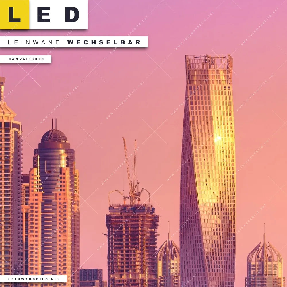 Du bist auf der Suche nach einem Architektur - Gebäude, Städte - Skylines LED Leinwandbild im Quadratischen Format? Begriffe wie Skyline, Sonnenuntergang, Dubai, Hochhäuser, Wolkenkratzer, Stadt haben Dich auf der Suche nach Deinem neuen XXL LED Wandbild mit wechselbarer Leinwand inspiriert? Farben wie Gold, Lila, Pink dürfen auf Deinem neuen Leinwand-LED-Bild nicht fehlen und Leuchtbilder im Natürlich - Realistisch, Modern Art Stil passen perfekt zu Deinem Einrichtungsstil?