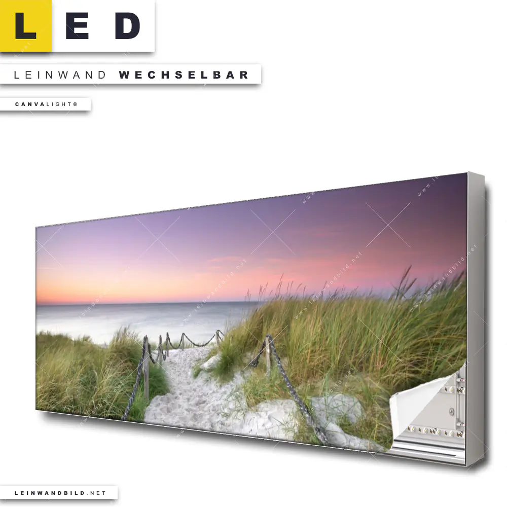 Du konfigurierst Dein individuelles LED Leinwandbild Canvalight® TEX | Strandweg im Sonnenuntergang | Panorama und wir produzieren es NEU für Dich. Unsere Landschaften, Strand - Meer LED Bilder mit wechselbarer Textil-Leinwand sind KEINE Lagerware. Du bist Dir unsicher, welches Motiv oder Format das richtige für dein individuelles Canvalight® Leuchtbild ist, dann helfen wir dir gerne weiter und beraten dich!
