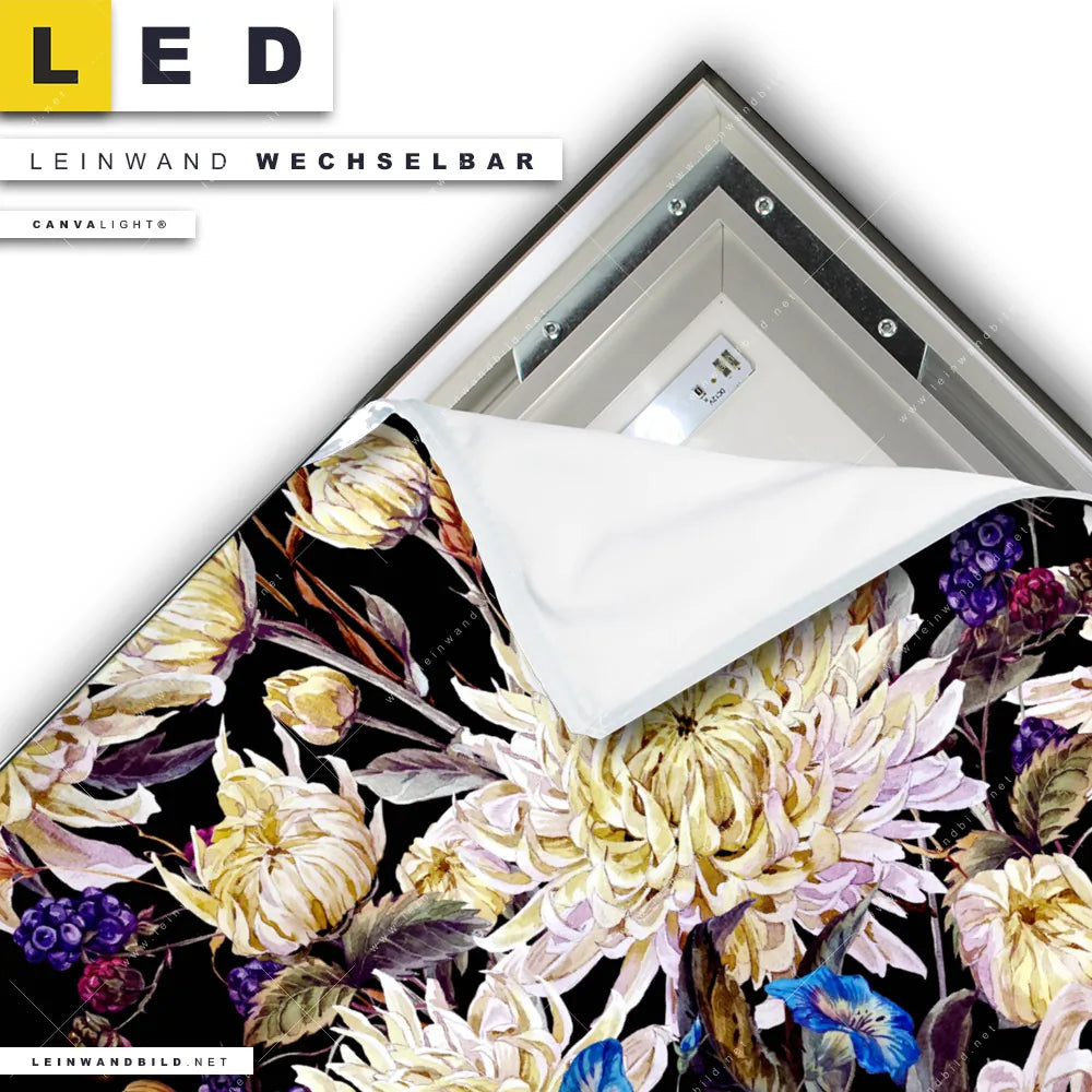 Du konfigurierst Dein individuelles LED Leinwandbild Canvalight® TEX | Aquarell von wilden Blumen | Quadrat und wir produzieren es NEU für Dich. Unsere Blumen - Botanik LED Bilder mit wechselbarer Textil-Leinwand sind KEINE Lagerware. Du bist Dir unsicher, welches Motiv oder Format das richtige für dein individuelles Canvalight® Leuchtbild ist, dann helfen wir dir gerne weiter und beraten dich!