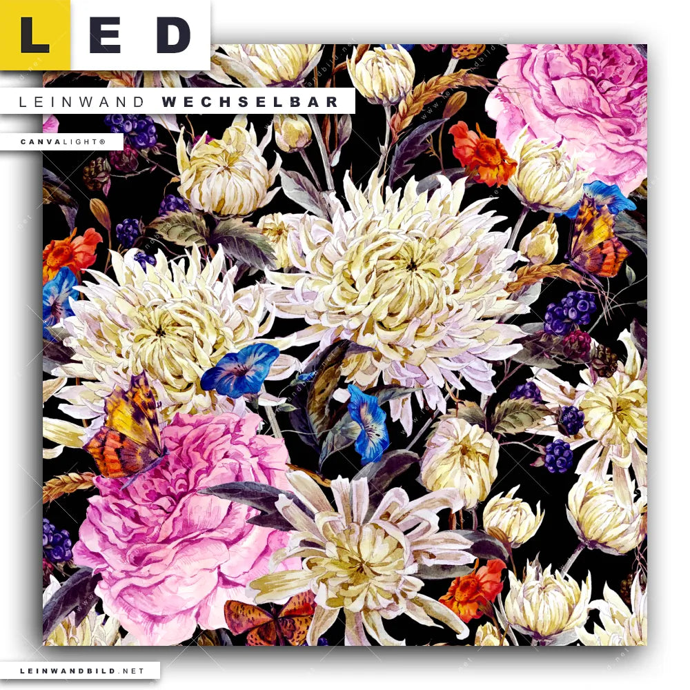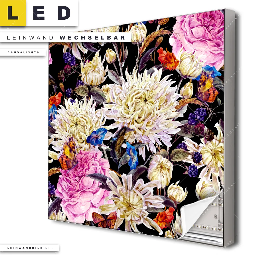Du bist auf der Suche nach einem Blumen - Botanik LED Leinwandbild im Quadratischen Format? Begriffe wie Blume, Botanik, Pflanze, Natur, Aquarell, Wasserfarbe, Blumen, romantisch, Blüten, Bouquet, Blumenstrauß, Schmetterling haben Dich auf der Suche nach Deinem neuen XXL LED Wandbild mit wechselbarer Leinwand inspiriert? Farben wie Weiss, Schwarz, Blau, Lila, Orange, Rot, Rosa dürfen auf Deinem neuen Leinwand-LED-Bild nicht fehlen und Leuchtbilder im Floral, Retro - Vintage Stil passen perfekt zu Deinem Einrichtungsstil?