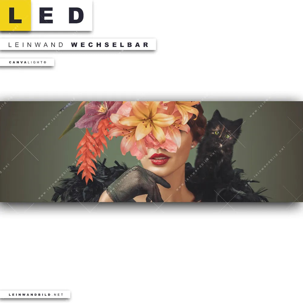 Dann sollte das LED Leinwandbild Canvalight® TEX | Blumenportrait einer Frau | Panorama den Weg zu Dir finden. Das stufenlos dimmbare Leinwandbild Frau mit schwarzer Katze im steckerfertigen Leuchtrahmen mit Fernbedienung und optionaler Farbtemperatursteuerung fügt sich als Eye-Catcher harmonisch in jedes Bar - Gastronomie, Friseur - Beauty, Wohnzimmer - Schlafzimmer Raumkonzept ein.