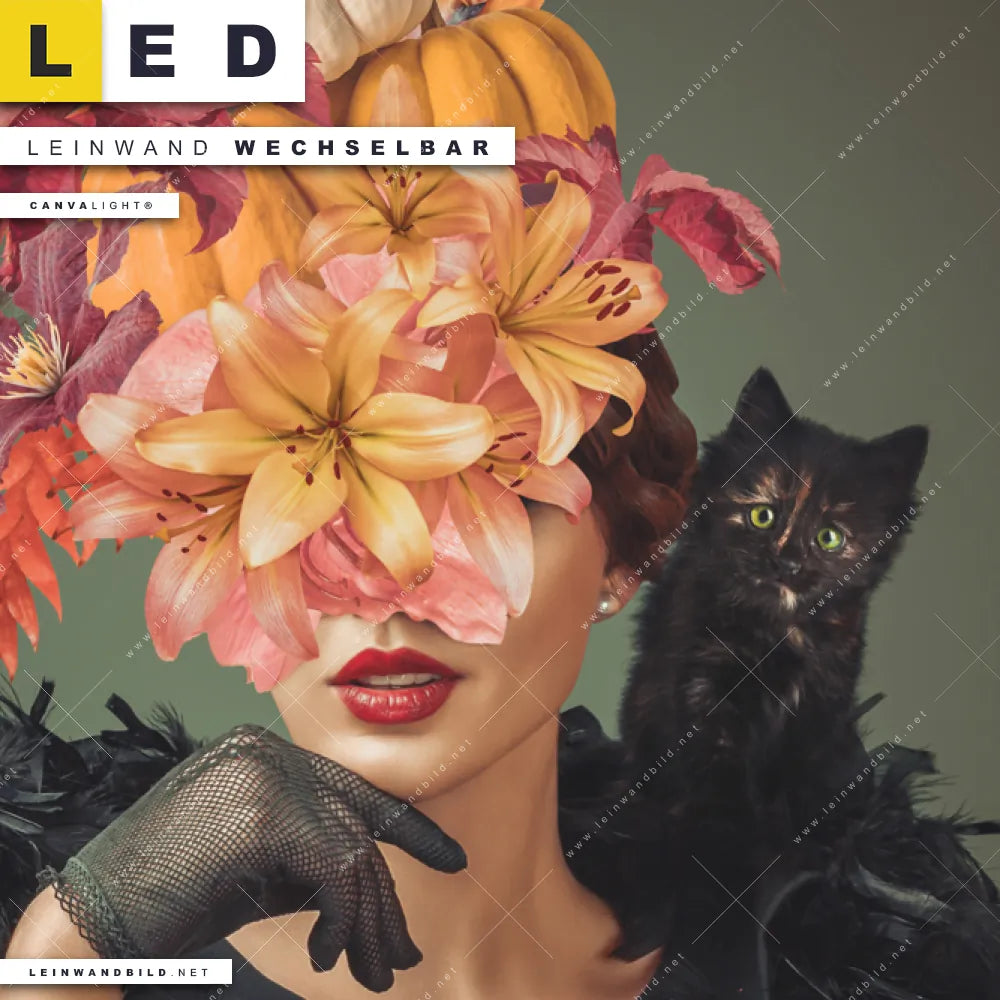 Du bist auf der Suche nach einem Porträts - Menschen, Blumen - Botanik LED Leinwandbild im Panorama-Format? Begriffe wie Menschen & Blumen, Frau, Porträt, modern, Beauty, Gesicht, Blumen, Blüten, Schönheit, Mode, Halloween, Katze, Echse, Kürbis haben Dich auf der Suche nach Deinem neuen XXL LED Wandbild mit wechselbarer Leinwand inspiriert? Farben wie Schwarz, Orange, Beige, Rot dürfen auf Deinem neuen extra breiten Leinwand-LED-Bild nicht fehlen und Leuchtbilder im Modern Art, Floral Stil passen perfekt zu Deinem Einrichtungsstil?