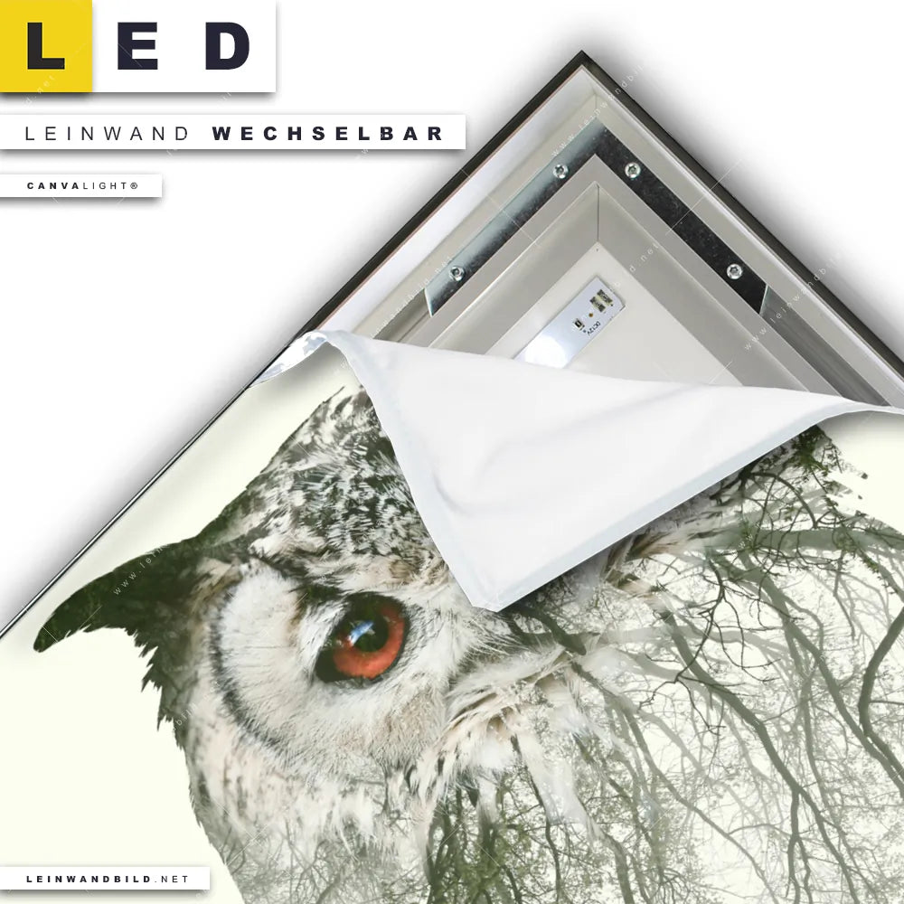 Du konfigurierst Dein individuelles LED Leinwandbild Canvalight® TEX | Eule & Wald No.1 | Quadrat und wir produzieren es NEU für Dich. Unsere Tierwelt LED Bilder mit wechselbarer Textil-Leinwand sind KEINE Lagerware. Du bist Dir unsicher, welches Motiv oder Format das richtige für dein individuelles Canvalight® Leuchtbild ist, dann helfen wir dir gerne weiter und beraten dich!