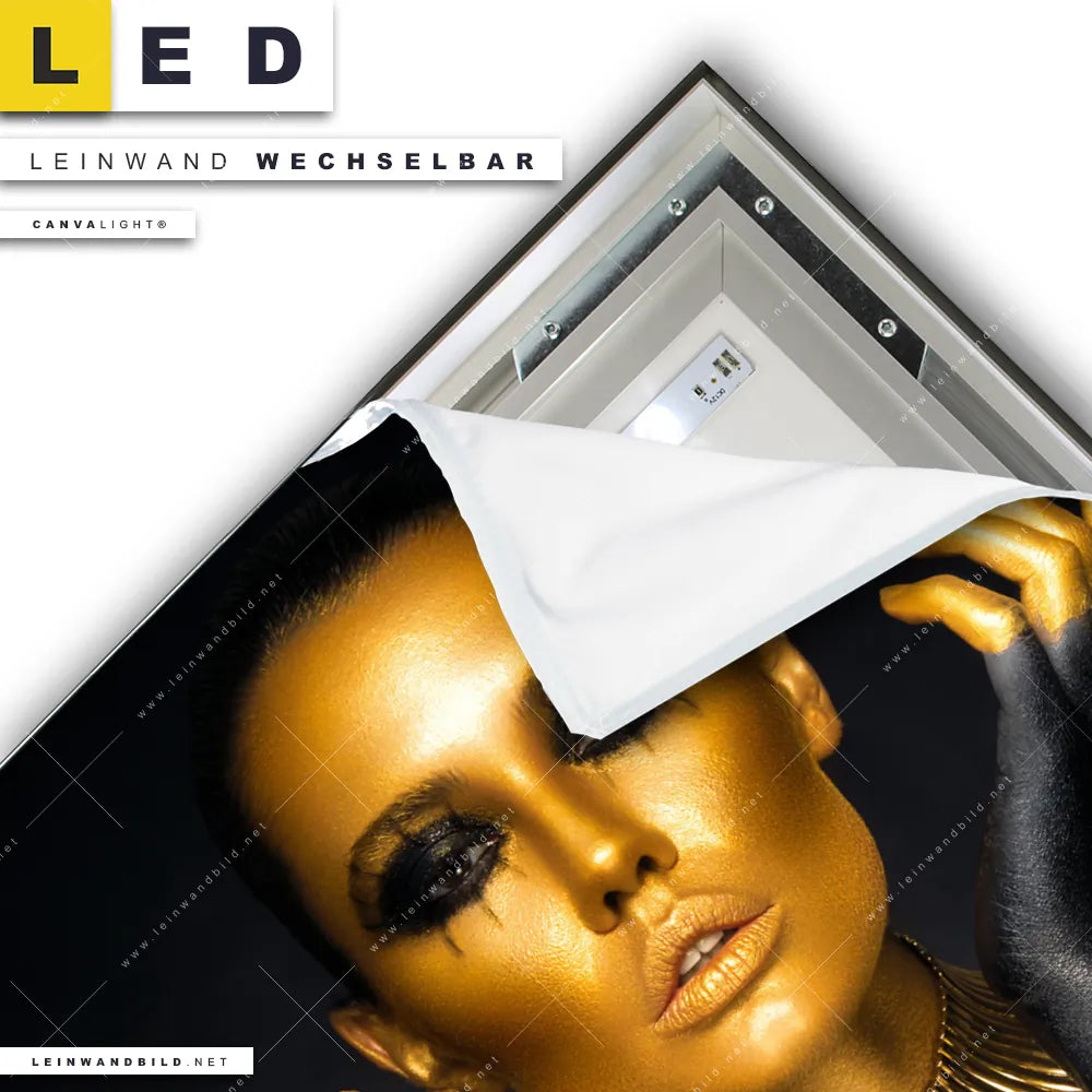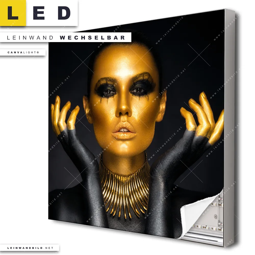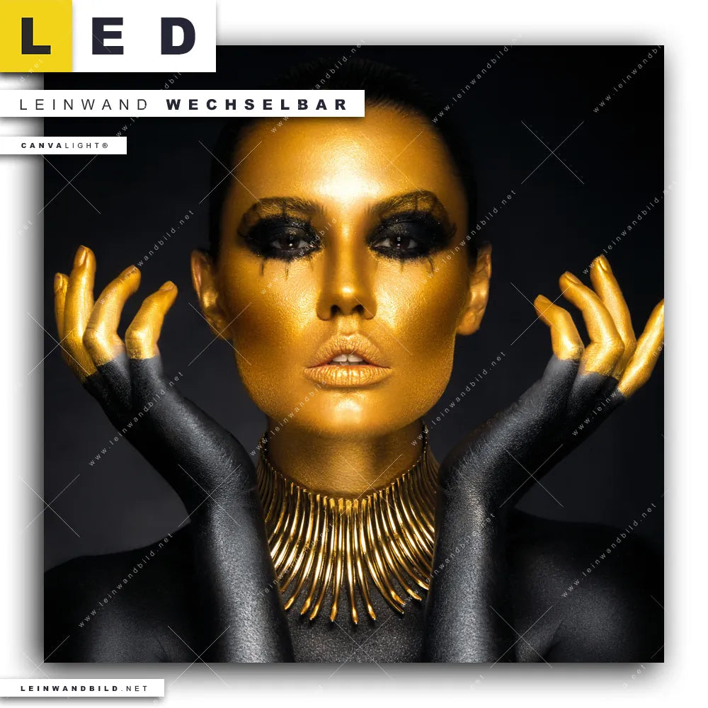 Du bist auf der Suche nach einem Porträts - Menschen LED Leinwandbild im Quadratischen Format? Begriffe wie Frau, Beauty, Gesicht, Körper, Lippen, Mund, Make-up haben Dich auf der Suche nach Deinem neuen XXL LED Wandbild mit wechselbarer Leinwand inspiriert? Farben wie Gold, Schwarz dürfen auf Deinem neuen Leinwand-LED-Bild nicht fehlen und Leuchtbilder im Modern Art Stil passen perfekt zu Deinem Einrichtungsstil?