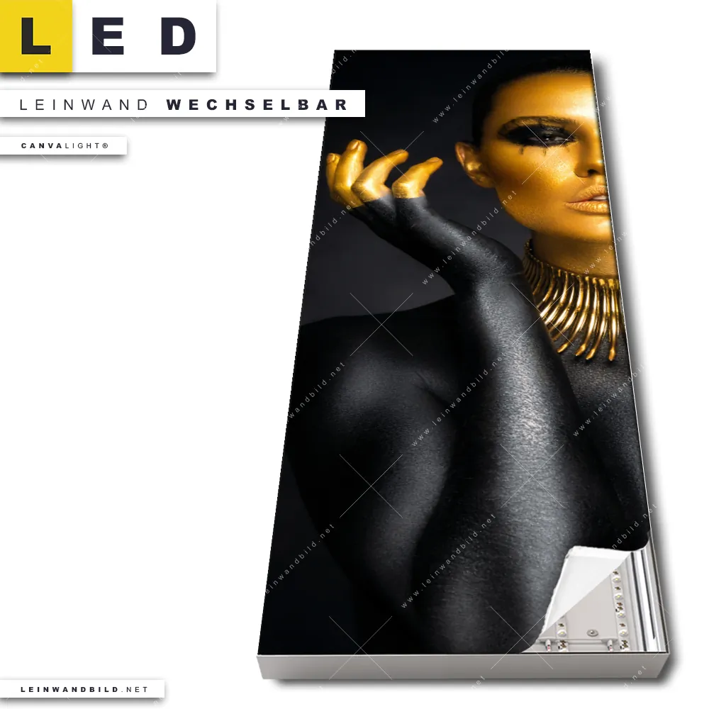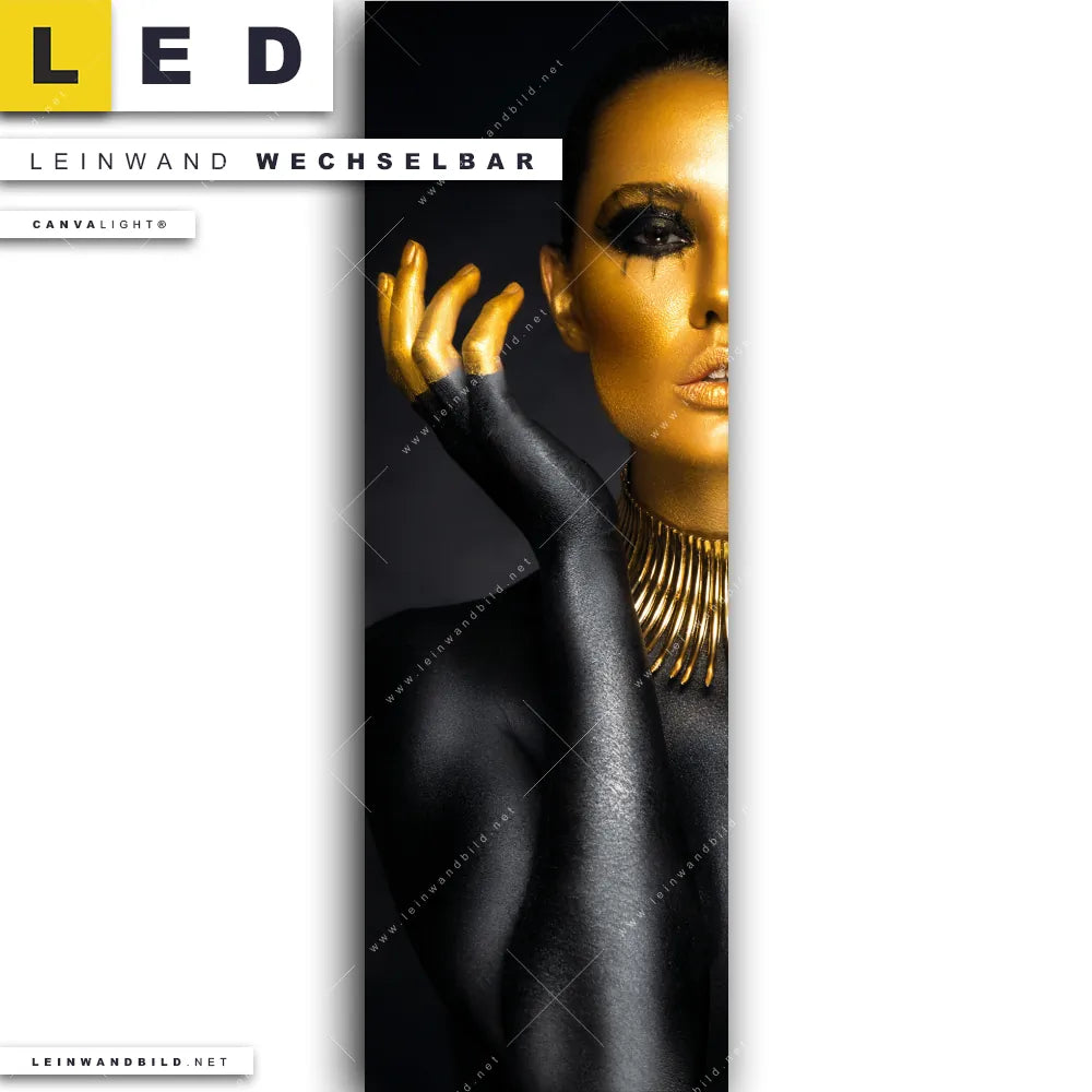 Du bist auf der Suche nach einem Porträts - Menschen LED Leinwandbild im Schmalen Format? Begriffe wie Frau, Beauty, Gesicht, Körper, Lippen, Mund, Make-up haben Dich auf der Suche nach Deinem neuen XXL LED Wandbild mit wechselbarer Leinwand inspiriert? Farben wie Gold, Schwarz dürfen auf Deinem neuen Leinwand-LED-Bild im Panorama-Hochformat nicht fehlen und Leuchtbilder im Modern Art Stil passen perfekt zu Deinem Einrichtungsstil?