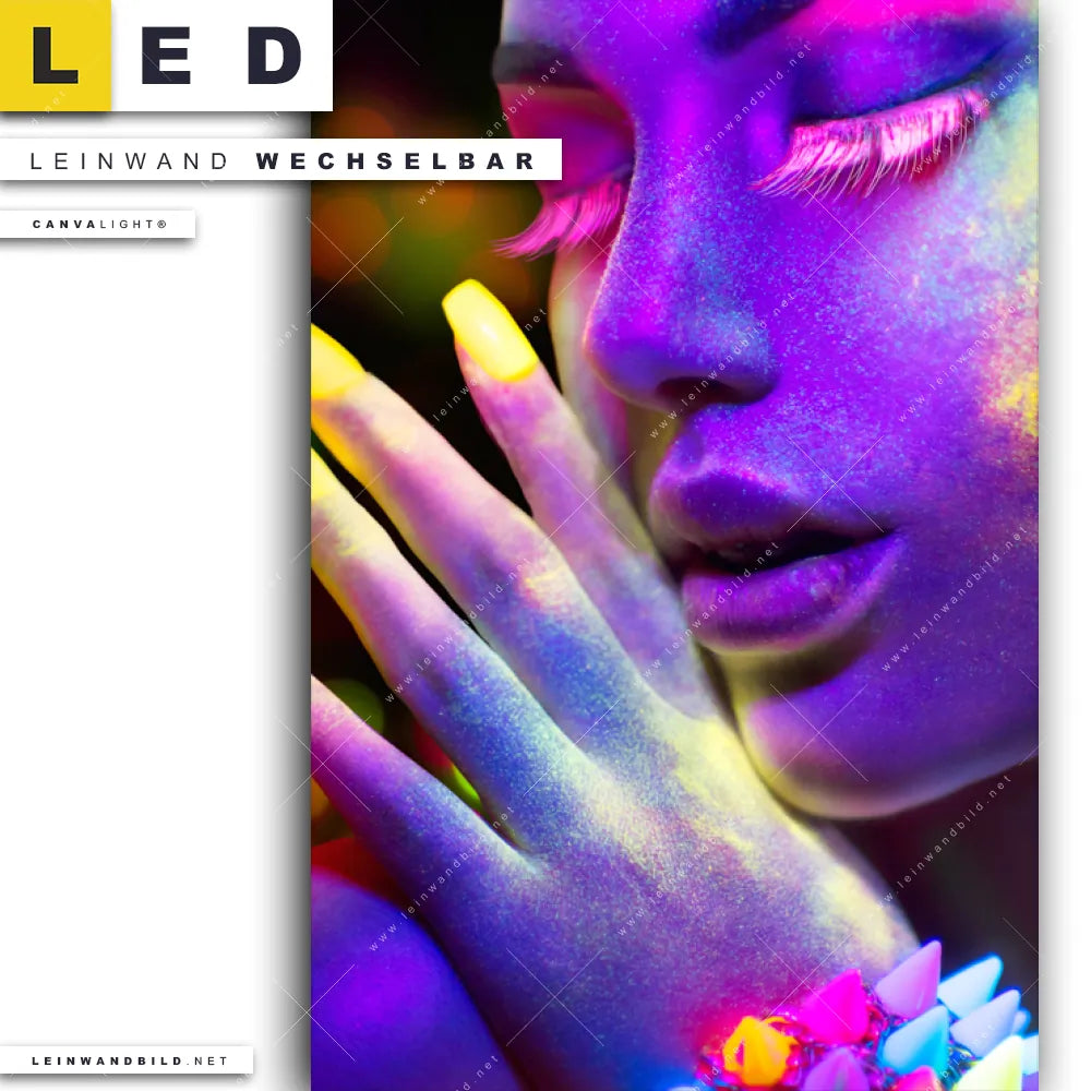Du bist auf der Suche nach einem Porträts - Menschen LED Leinwandbild im Hochformat? Begriffe wie Frau, Porträt, Farbe, Beauty, Gesicht, Körper, Neon, Neonlicht, Make-up haben Dich auf der Suche nach Deinem neuen XXL LED Wandbild mit wechselbarer Leinwand inspiriert? Farben wie Schwarz, Lila, Pink dürfen auf Deinem neuen Leinwand-LED-Bild nicht fehlen und Leuchtbilder im Modern Art, Pop Art Stil passen perfekt zu Deinem Einrichtungsstil?