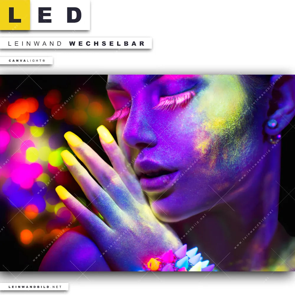 Dann sollte das LED Leinwandbild Canvalight® TEX | Frau im Neonlicht | Querformat den Weg zu Dir finden. Das stufenlos dimmbare Leinwandbild Neonfarben auf der Haut im steckerfertigen Leuchtrahmen mit Fernbedienung und optionaler Farbtemperatursteuerung fügt sich als Eye-Catcher harmonisch in jedes Bar - Gastronomie, Friseur - Beauty, Wohnzimmer - Schlafzimmer Raumkonzept ein.