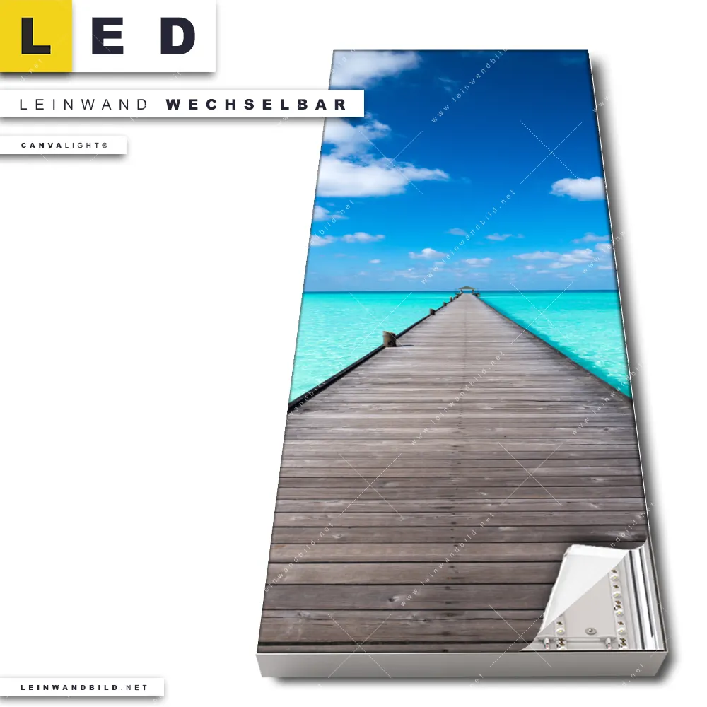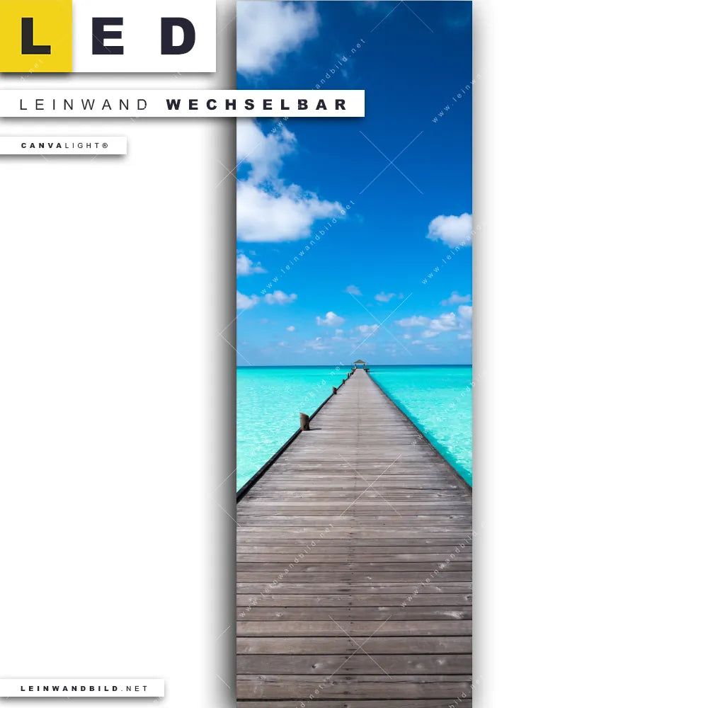 Du bist auf der Suche nach einem Strand - Meer, Landschaften LED Leinwandbild im Schmalen Format? Begriffe wie Meer, Steg, Strand, Sommer, Weg, Südsee - Karibik, Urlaub - Reisen haben Dich auf der Suche nach Deinem neuen XXL LED Wandbild mit wechselbarer Leinwand inspiriert? Farben wie Blau, Türkis dürfen auf Deinem neuen Leinwand-LED-Bild im Panorama-Hochformat nicht fehlen und Leuchtbilder im Natürlich - Realistisch Stil passen perfekt zu Deinem Einrichtungsstil?