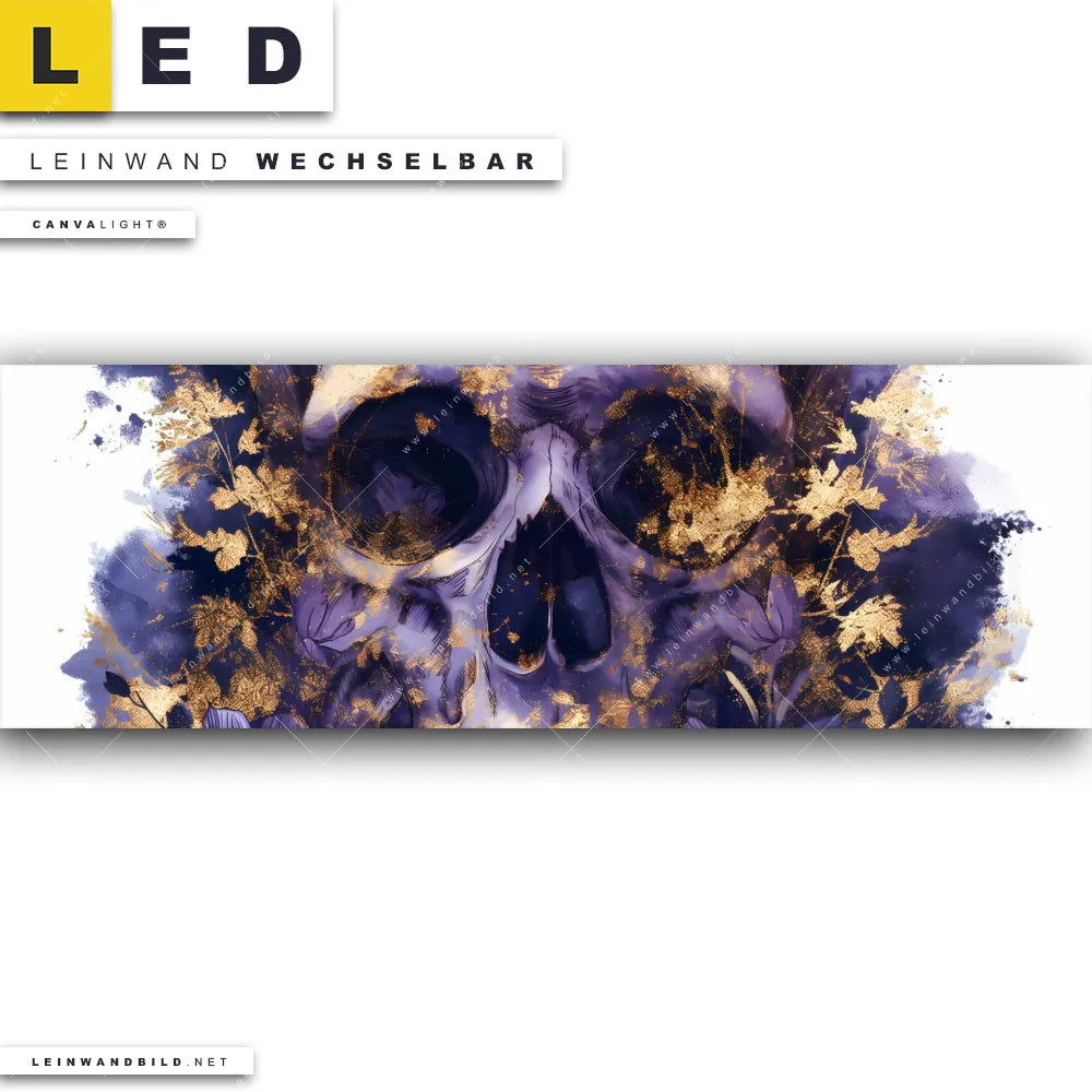 Du bist auf der Suche nach einem Porträts - Menschen, Blumen - Botanik LED Leinwandbild im Panorama-Format? Begriffe wie Schädel, Totenkopf, Skelett, Knochen, Blumen, Blüten haben Dich auf der Suche nach Deinem neuen XXL LED Wandbild mit wechselbarer Leinwand inspiriert? Farben wie Weiss, Gold, Lila dürfen auf Deinem neuen extra breiten Leinwand-LED-Bild nicht fehlen und Leuchtbilder im Modern Art, Floral Stil passen perfekt zu Deinem Einrichtungsstil?