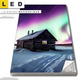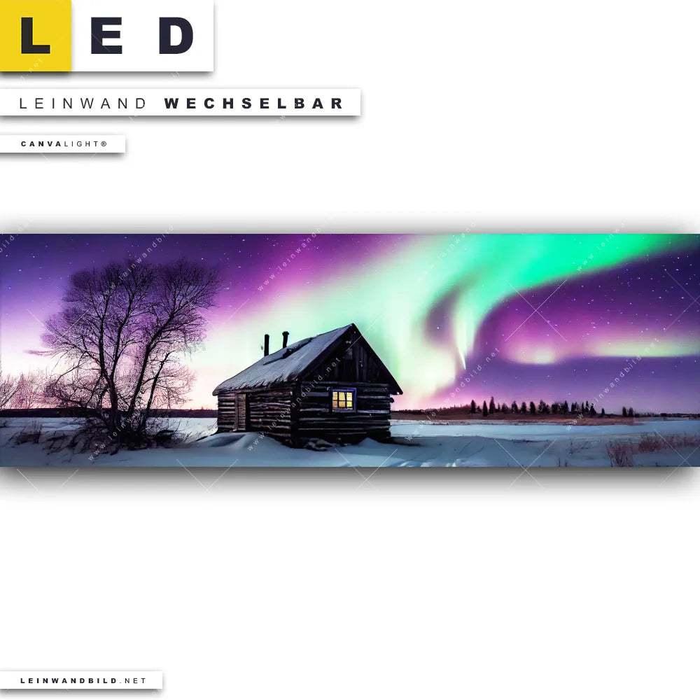LED Leinwandbild Canvalight® TEX | Nordlichter über einem Holzhaus | Panorama