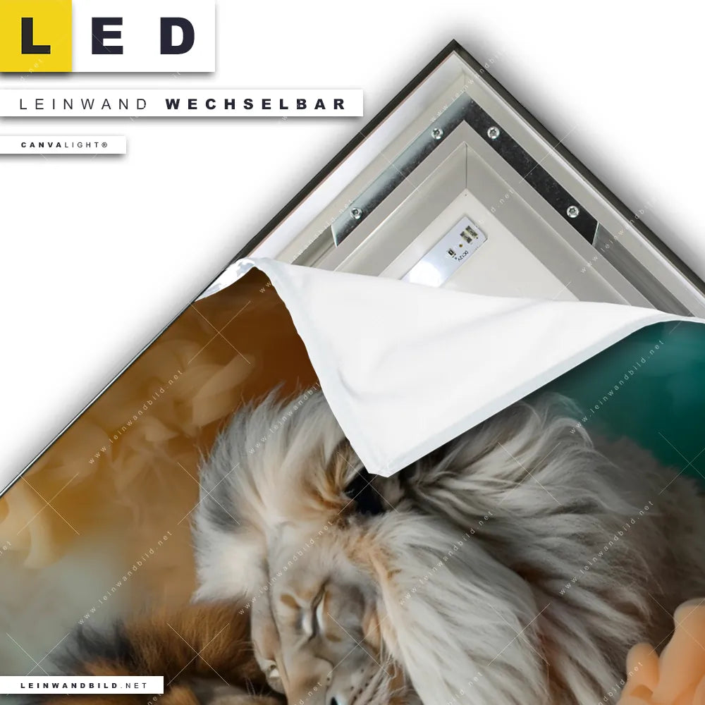 Du konfigurierst Dein individuelles LED Leinwandbild Canvalight® TEX | Sanfte Löwenmomente in buntem Nebel | Querformat und wir produzieren es NEU für Dich. Unsere Tierwelt LED Bilder mit wechselbarer Textil-Leinwand sind KEINE Lagerware. Du bist Dir unsicher, welches Motiv oder Format das richtige für dein individuelles Canvalight® Leuchtbild ist, dann helfen wir dir gerne weiter und beraten dich!