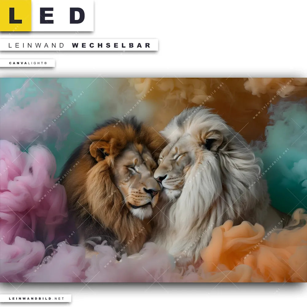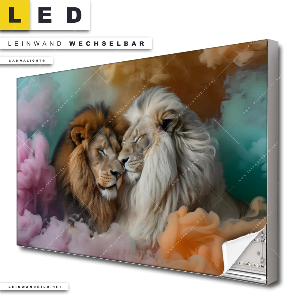 LED Leinwandbild Canvalight® TEX | Sanfte Löwenmomente in buntem Nebel | Querformat