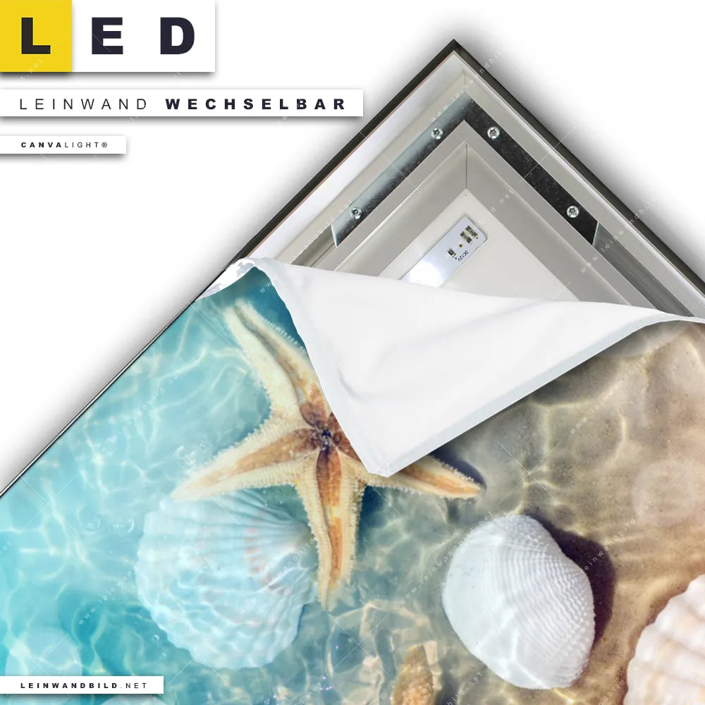 Du konfigurierst Dein individuelles LED Leinwandbild Canvalight® TEX | Seesterne & Muscheln | Hochformat und wir produzieren es NEU für Dich. Unsere Strand - Meer LED Bilder mit wechselbarer Textil-Leinwand sind KEINE Lagerware. Du bist Dir unsicher, welches Motiv oder Format das richtige für dein individuelles Canvalight® Leuchtbild ist, dann helfen wir dir gerne weiter und beraten dich!