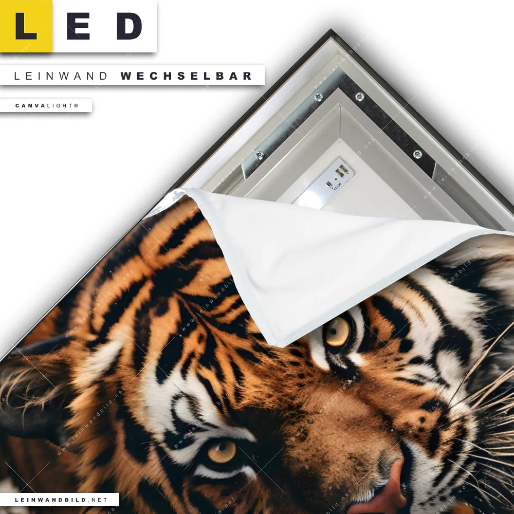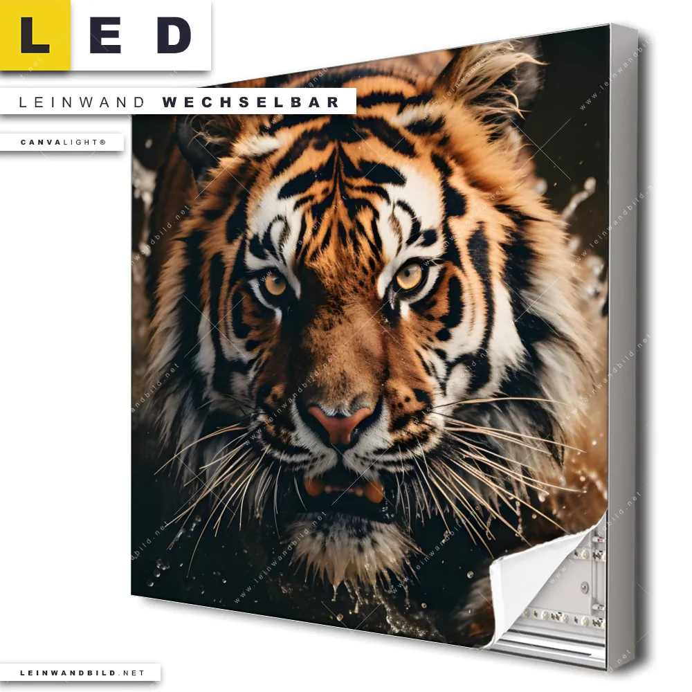 Du konfigurierst Dein individuelles LED Leinwandbild Canvalight® TEX | Tiger im Wasser | Quadrat und wir produzieren es NEU für Dich. Unsere Tierwelt LED Bilder mit wechselbarer Textil-Leinwand sind KEINE Lagerware. Du bist Dir unsicher, welches Motiv oder Format das richtige für dein individuelles Canvalight® Leuchtbild ist, dann helfen wir dir gerne weiter und beraten dich!