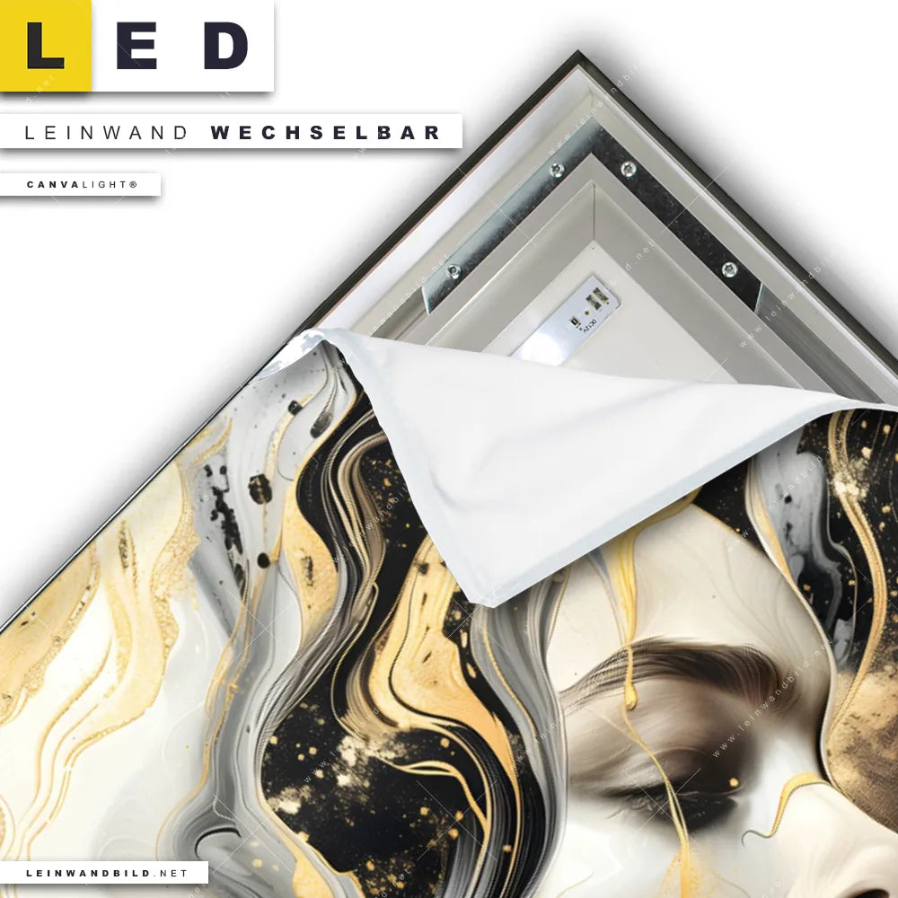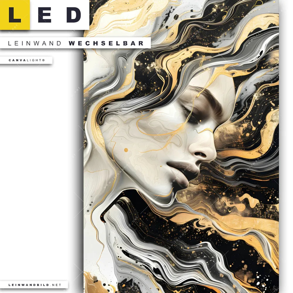 Du bist auf der Suche nach einem Porträts - Menschen, Muster - Texturen LED Leinwandbild im Hochformat? Begriffe wie Frau, Gesicht, Fluid Art haben Dich auf der Suche nach Deinem neuen XXL LED Wandbild mit wechselbarer Leinwand inspiriert? Farben wie Weiss, Schwarz, Gold dürfen auf Deinem neuen Leinwand-LED-Bild nicht fehlen und Leuchtbilder im Abstrakt, Modern Art Stil passen perfekt zu Deinem Einrichtungsstil?