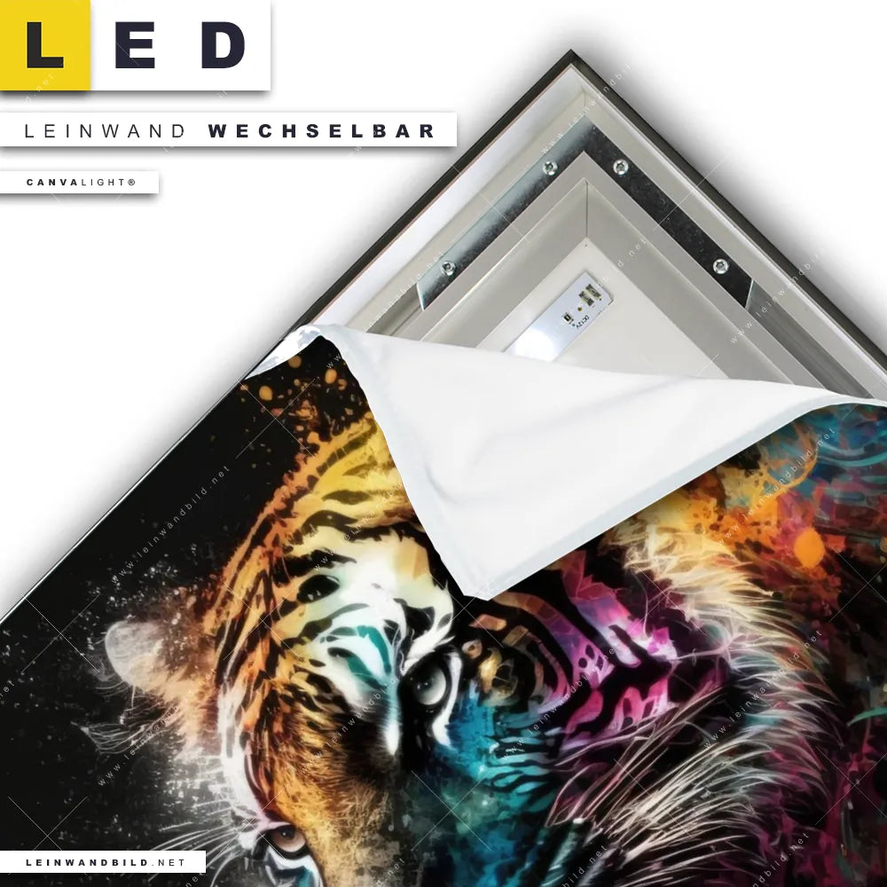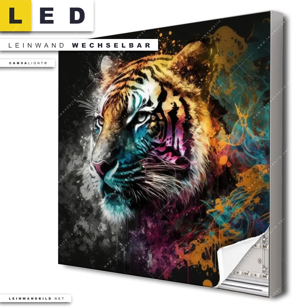 Du konfigurierst Dein individuelles LED Leinwandbild Canvalight® TEX | Tiger im Farbrausch | Quadrat und wir produzieren es NEU für Dich. Unsere Tierwelt LED Bilder mit wechselbarer Textil-Leinwand sind KEINE Lagerware. Du bist Dir unsicher, welches Motiv oder Format das richtige für dein individuelles Canvalight® Leuchtbild ist, dann helfen wir dir gerne weiter und beraten dich!