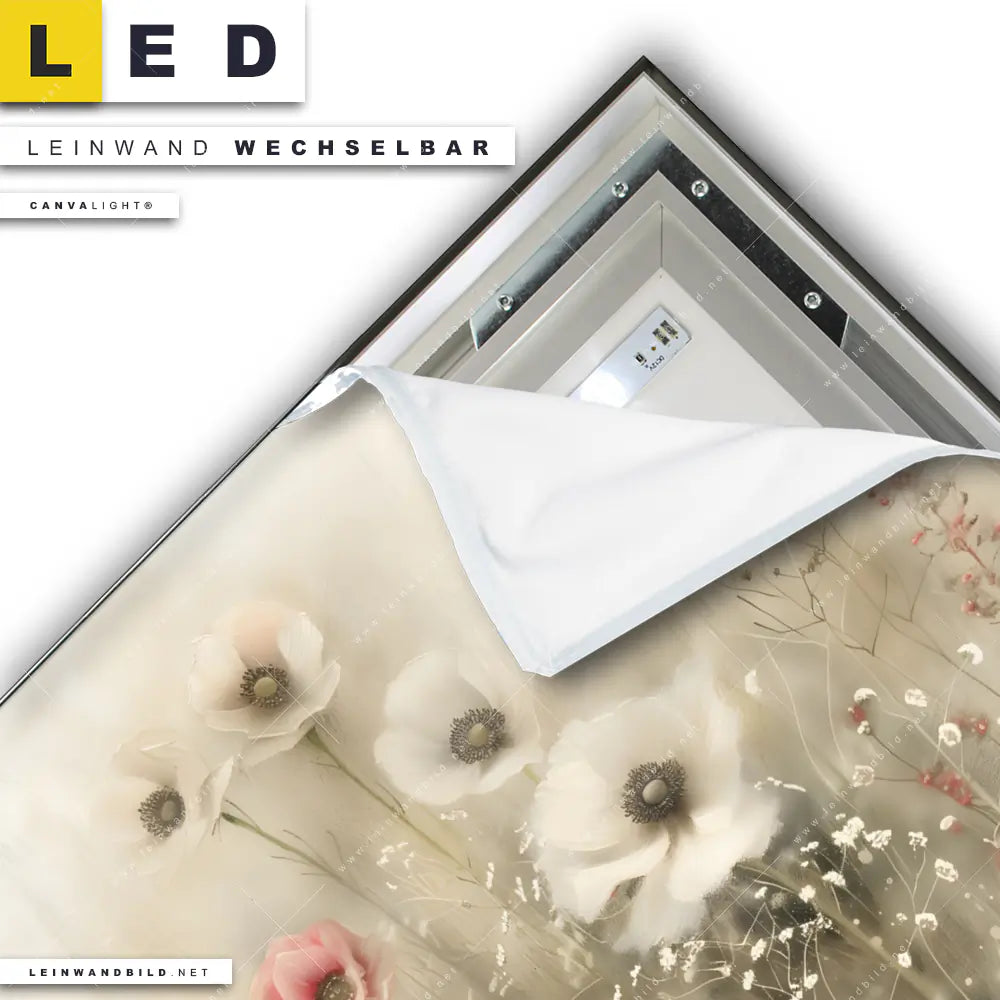Du konfigurierst Dein individuelles LED Leinwandbild Canvalight® TEX | Zarte Wildblumen in Pastelltönen | Quadrat und wir produzieren es NEU für Dich. Unsere Blumen - Botanik, Landschaften LED Bilder mit wechselbarer Textil-Leinwand sind KEINE Lagerware. Du bist Dir unsicher, welches Motiv oder Format das richtige für dein individuelles Canvalight® Leuchtbild ist, dann helfen wir dir gerne weiter und beraten dich!