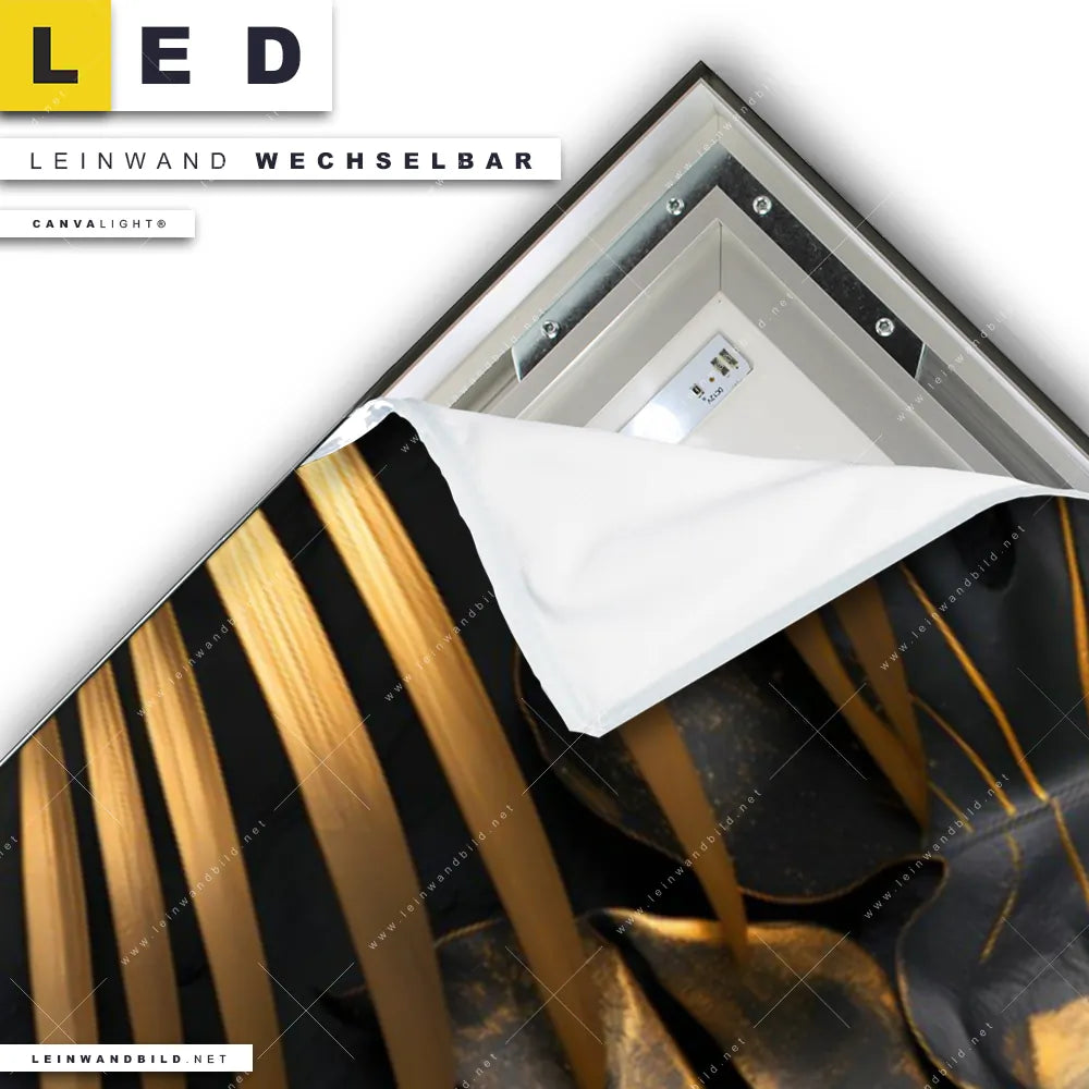 Du konfigurierst Dein individuelles LED Leinwandbild Canvalight® TEX | Palmenblätter Schwarz Gold | Panorama und wir produzieren es NEU für Dich. Unsere Muster - Texturen, Blumen - Botanik LED Bilder mit wechselbarer Textil-Leinwand sind KEINE Lagerware. Du bist Dir unsicher, welches Motiv oder Format das richtige für dein individuelles Canvalight® Leuchtbild ist, dann helfen wir dir gerne weiter und beraten dich!