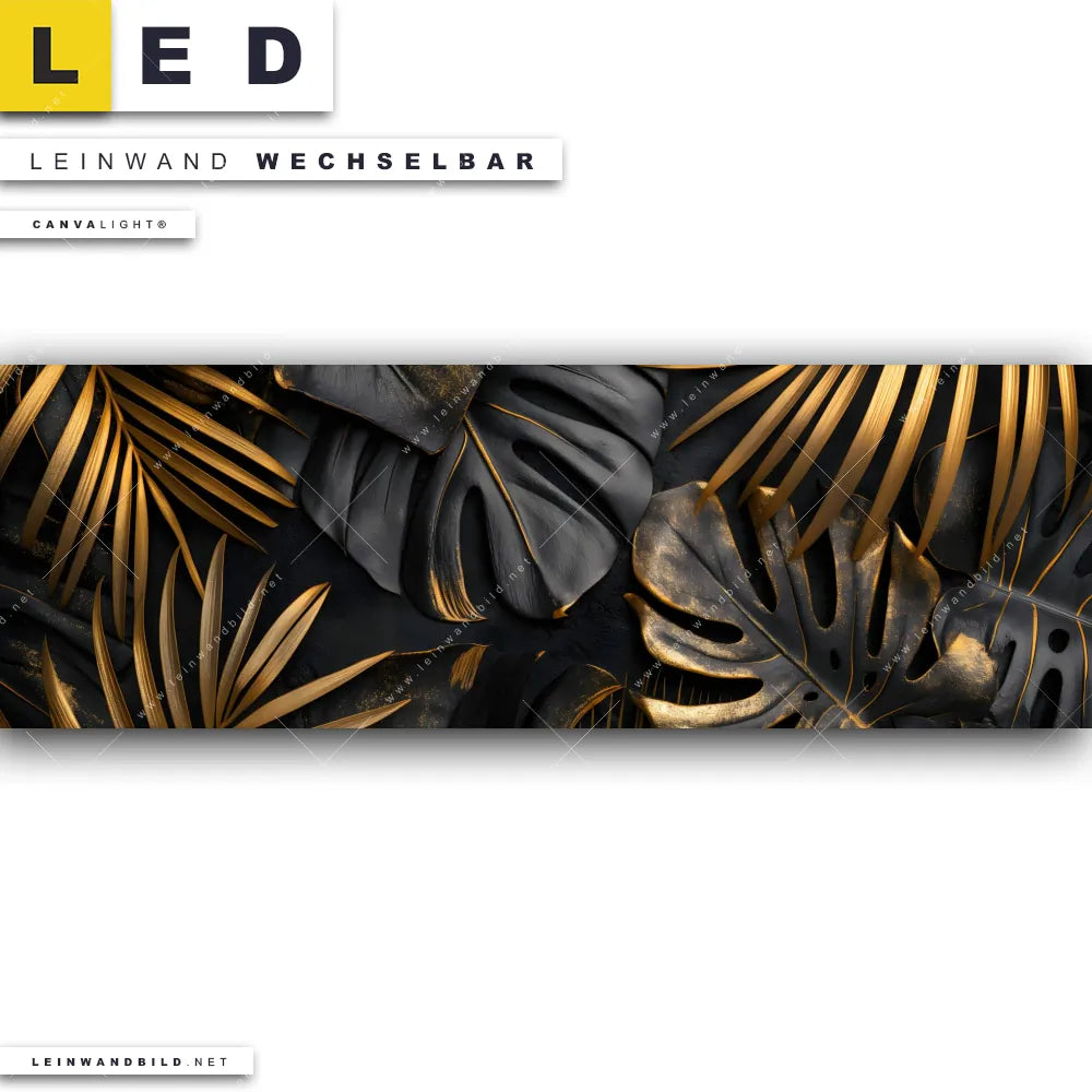 Du bist auf der Suche nach einem Muster - Texturen, Blumen - Botanik LED Leinwandbild im Panorama-Format? Begriffe wie Blätter, Pflanze, Natur, Nahaufnahme, Laub, Dschungel, Monstera, Palmenblätter haben Dich auf der Suche nach Deinem neuen XXL LED Wandbild mit wechselbarer Leinwand inspiriert? Farben wie Schwarz, Gold dürfen auf Deinem neuen extra breiten Leinwand-LED-Bild nicht fehlen und Leuchtbilder im Floral, Modern Art Stil passen perfekt zu Deinem Einrichtungsstil?