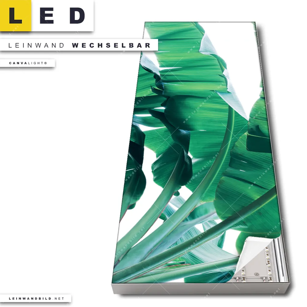 Dann sollte das LED Leinwandbild Canvalight® TEX | Bananenpalme | Schmal den Weg zu Dir finden. Das stufenlos dimmbare Leinwandbild Bananenblätter im steckerfertigen Leuchtrahmen mit Fernbedienung und optionaler Farbtemperatursteuerung fügt sich als Eye-Catcher harmonisch in jedes Arzt - Praxis, Büro - Kanzlei, Wohnzimmer - Schlafzimmer, Küche - Esszimmer Raumkonzept ein.