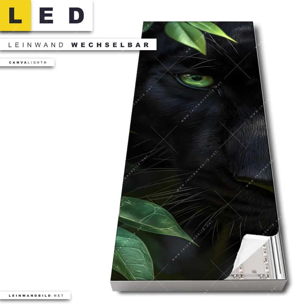 Du bist auf der Suche nach einem Tierwelt, Blumen - Botanik LED Leinwandbild im Schmalen Format? Begriffe wie Blätter, Natur, Nahaufnahme, Dschungel, Panther, Raubkatze, Regenwald, Wildkatze, Augen, Tierporträt haben Dich auf der Suche nach Deinem neuen XXL LED Wandbild mit wechselbarer Leinwand inspiriert? Farben wie Schwarz, Grün dürfen auf Deinem neuen Leinwand-LED-Bild im Panorama-Hochformat nicht fehlen und Leuchtbilder im Modern Art, Floral Stil passen perfekt zu Deinem Einrichtungsstil?