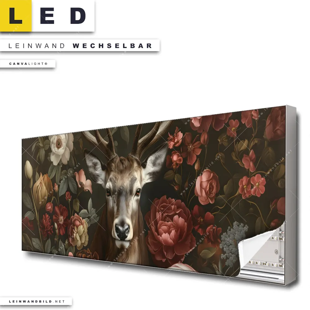 Du bist auf der Suche nach einem Tierwelt, Blumen - Botanik LED Leinwandbild im Panorama-Format? Begriffe wie Tierporträt, Hirsch, Blüten, Rotwild, Geweih, Blumen, Rothirsch, Pfingstrosen haben Dich auf der Suche nach Deinem neuen XXL LED Wandbild mit wechselbarer Leinwand inspiriert? Farben wie Braun, Weiss, Rot dürfen auf Deinem neuen extra breiten Leinwand-LED-Bild nicht fehlen und Leuchtbilder im Retro - Vintage, Floral Stil passen perfekt zu Deinem Einrichtungsstil?