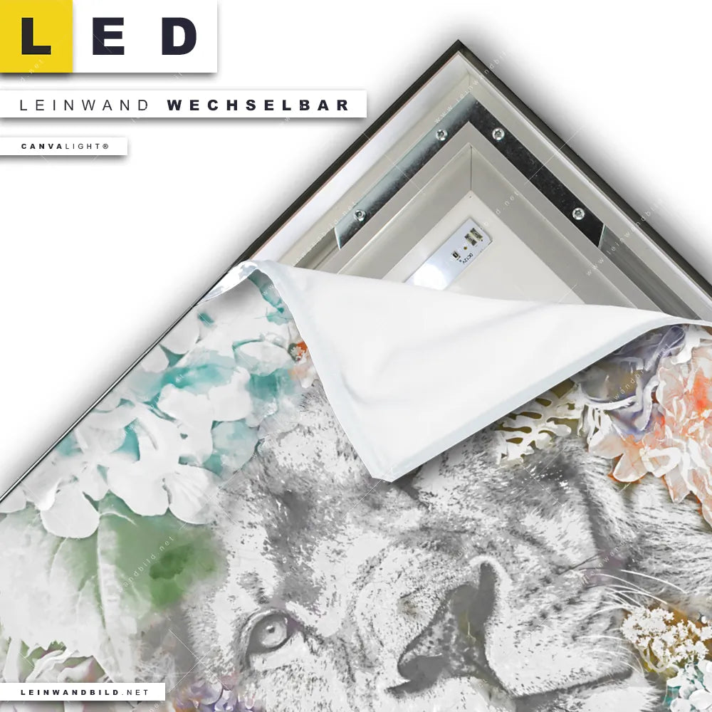 Du bist auf der Suche nach einem Tierwelt, Blumen - Botanik LED Leinwandbild im Quadratischen Format? Begriffe wie Tier, Blumen, Kunst, Aquarell, Löwe, Lion, Raubkatze, Blüten haben Dich auf der Suche nach Deinem neuen XXL LED Wandbild mit wechselbarer Leinwand inspiriert? Farben wie Rosa, Pink, Weiss, Grau , Grün, Gold, Orange, Braun, Beige dürfen auf Deinem neuen Leinwand-LED-Bild nicht fehlen und Leuchtbilder im Floral, Modern Art Stil passen perfekt zu Deinem Einrichtungsstil?