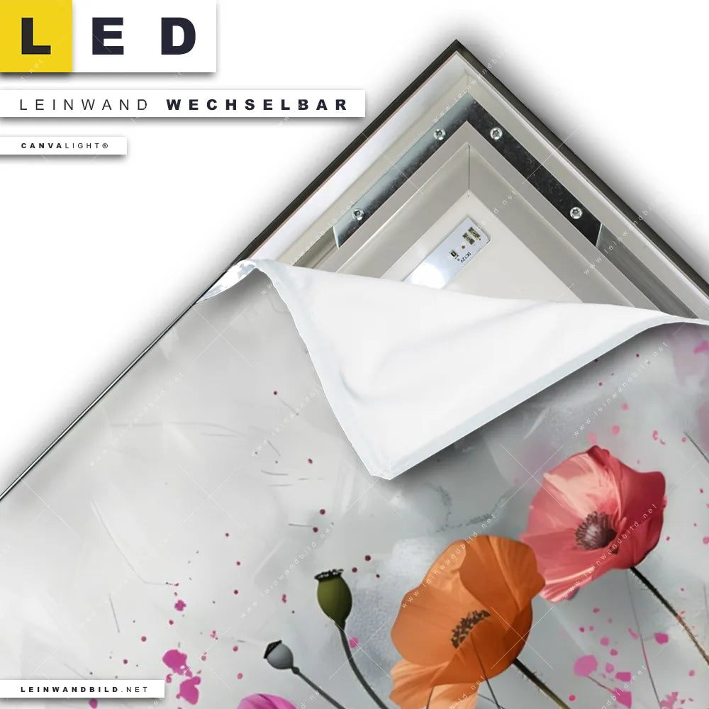 Du konfigurierst Dein individuelles LED Leinwandbild Canvalight® TEX | Zarte Mohnblumen im Wind | Hochformat und wir produzieren es NEU für Dich. Unsere Blumen - Botanik, Landschaften LED Bilder mit wechselbarer Textil-Leinwand sind KEINE Lagerware. Du bist Dir unsicher, welches Motiv oder Format das richtige für dein individuelles Canvalight® Leuchtbild ist, dann helfen wir dir gerne weiter und beraten dich!
