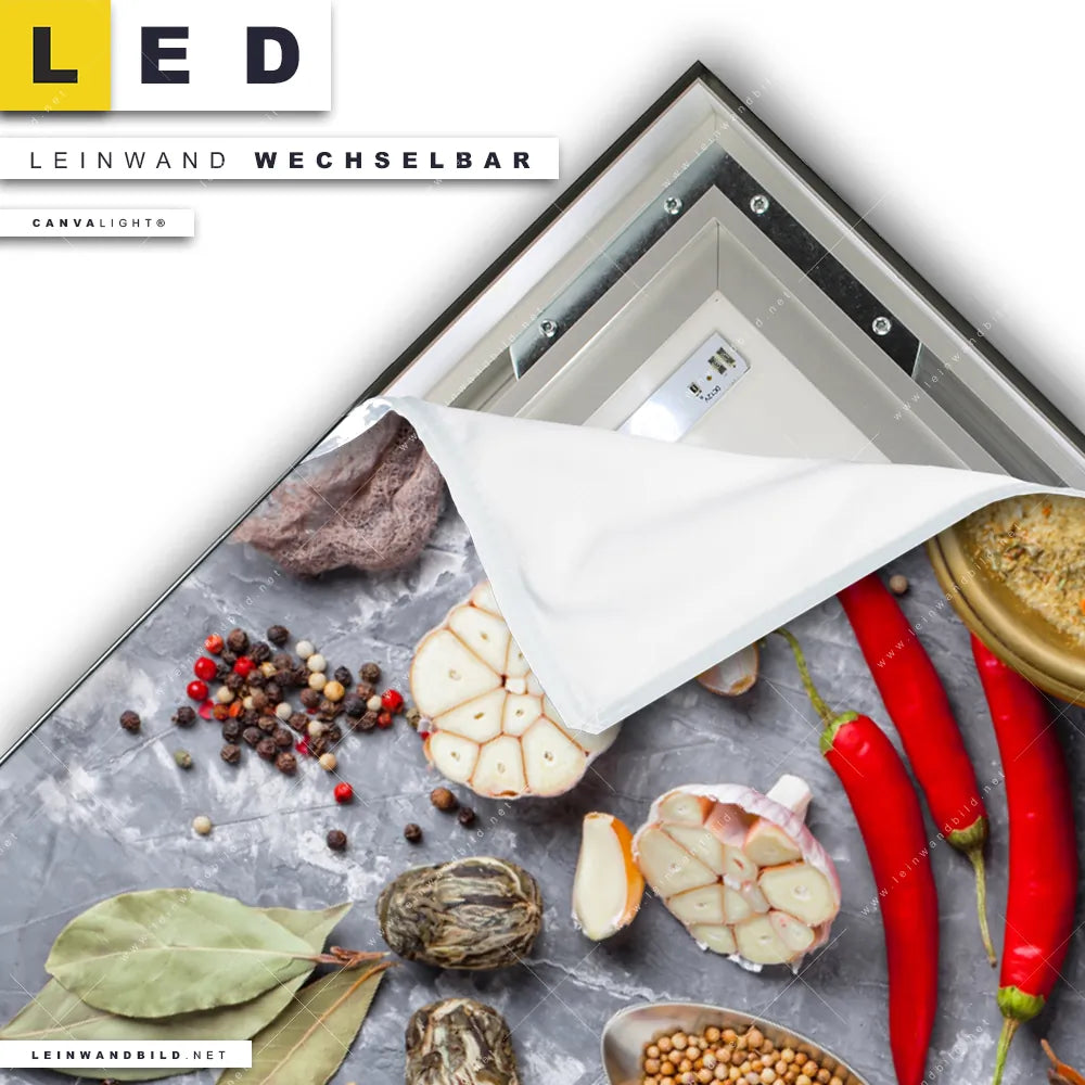 Du konfigurierst Dein individuelles LED Leinwandbild Canvalight® TEX | Aromatische Gewürze | Hochformat und wir produzieren es NEU für Dich. Unsere Essen - Trinken LED Bilder mit wechselbarer Textil-Leinwand sind KEINE Lagerware. Du bist Dir unsicher, welches Motiv oder Format das richtige für dein individuelles Canvalight® Leuchtbild ist, dann helfen wir dir gerne weiter und beraten dich!