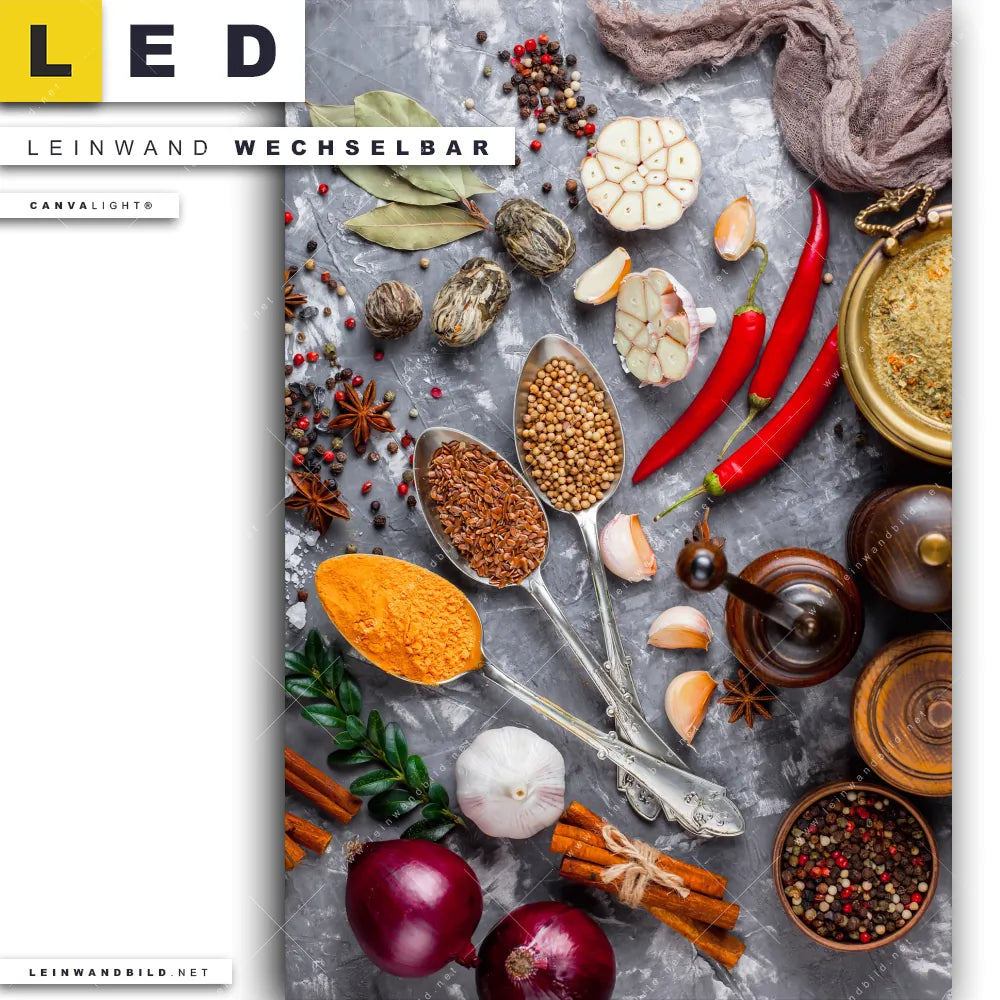Du bist auf der Suche nach einem Essen - Trinken LED Leinwandbild im Hochformat? Begriffe wie Gewürze, Kräuter, kochen, Pfeffer, Curry, Küche, Lebensmittel, gesund, Essen, Löffel, Besteck haben Dich auf der Suche nach Deinem neuen XXL LED Wandbild mit wechselbarer Leinwand inspiriert? Farben wie Braun, Beige, Grün, Ocker, Hellgrün, Orange, Rot, Rosa, Blau, Gelb , Hellblau, Mint, Lila dürfen auf Deinem neuen Leinwand-LED-Bild nicht fehlen und Leuchtbilder im Modern Art, Natürlich - Realistisch Stil passen perfekt zu Deinem Einrichtungsstil?