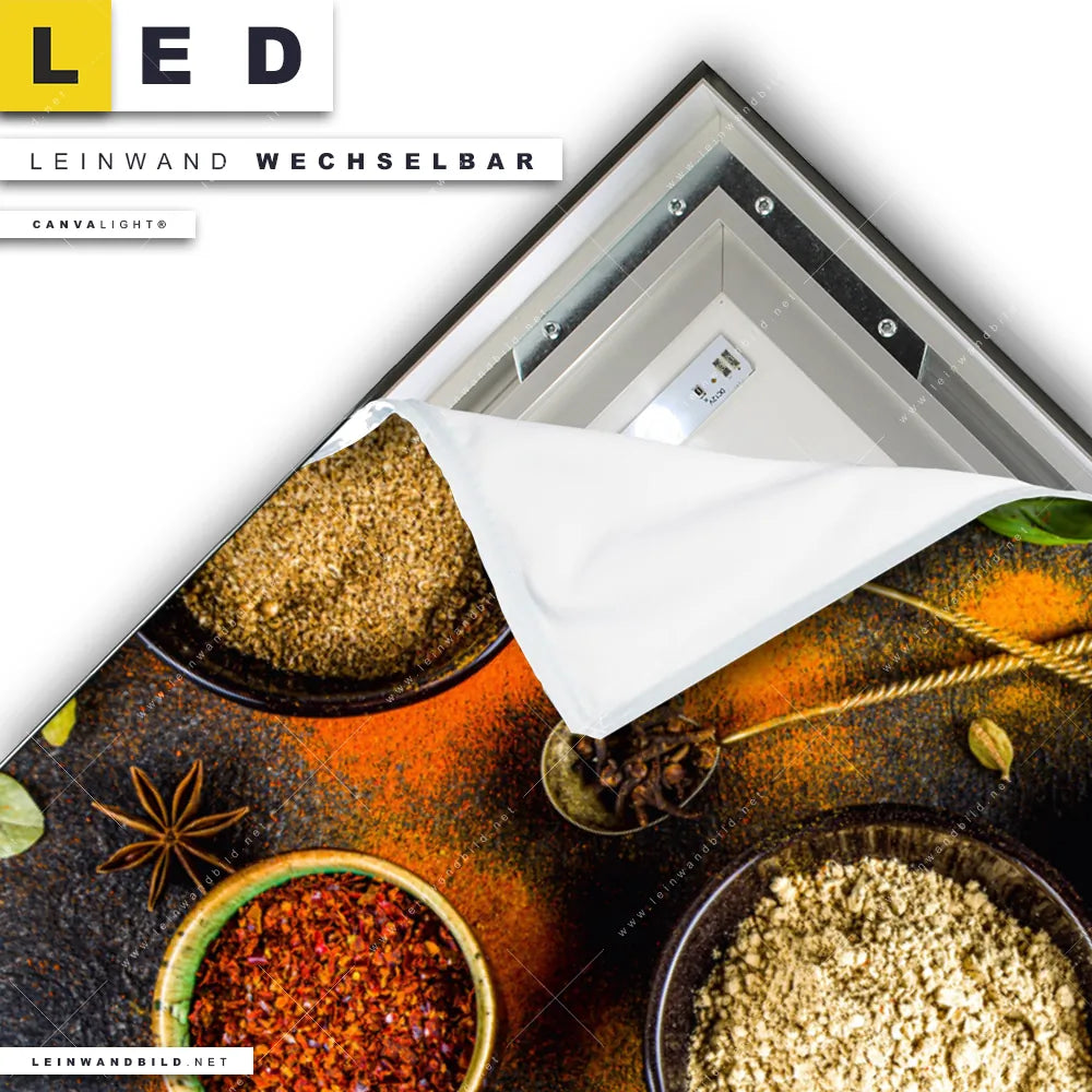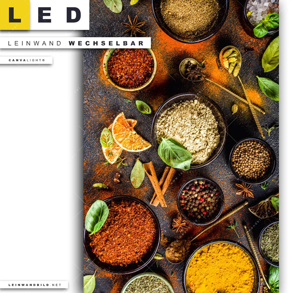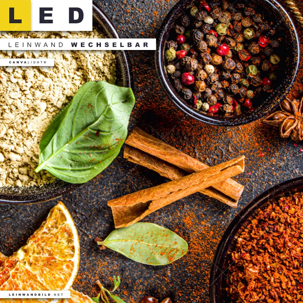 Du bist auf der Suche nach einem Essen - Trinken LED Leinwandbild im Hochformat? Begriffe wie Gewürze, Kräuter, kochen, Chili, Pfeffer, Ingwer, Paprika, Küche, Essen, Lebensmittel haben Dich auf der Suche nach Deinem neuen XXL LED Wandbild mit wechselbarer Leinwand inspiriert? Farben wie Braun, Beige, Grün, Orange, Rot, Ocker, Bunt dürfen auf Deinem neuen Leinwand-LED-Bild nicht fehlen und Leuchtbilder im Modern Art, Natürlich - Realistisch Stil passen perfekt zu Deinem Einrichtungsstil?