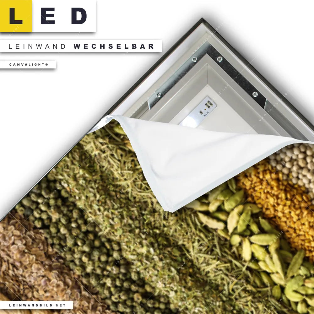 Du konfigurierst Dein individuelles LED Leinwandbild Canvalight® TEX | Bunte Gewürze | Panorama und wir produzieren es NEU für Dich. Unsere Essen - Trinken LED Bilder mit wechselbarer Textil-Leinwand sind KEINE Lagerware. Du bist Dir unsicher, welches Motiv oder Format das richtige für dein individuelles Canvalight® Leuchtbild ist, dann helfen wir dir gerne weiter und beraten dich!