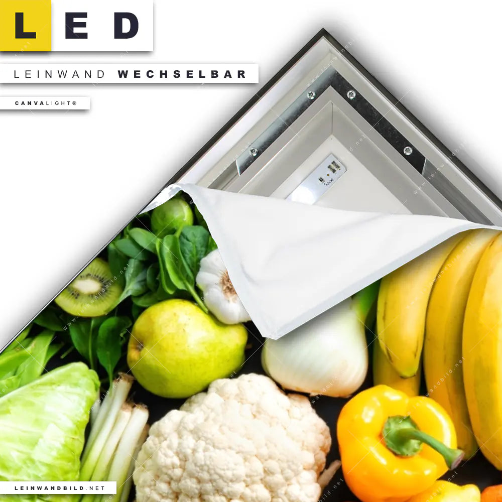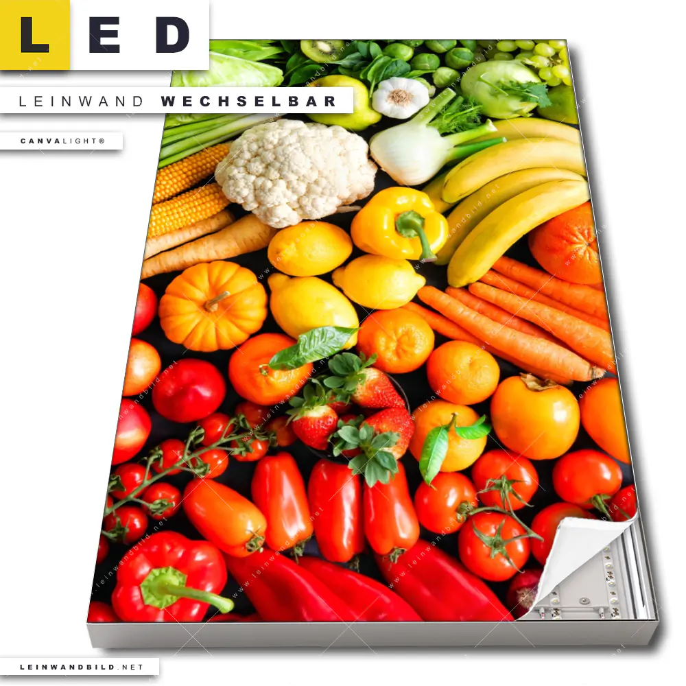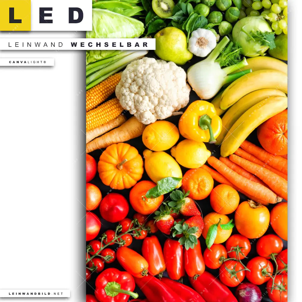 Du bist auf der Suche nach einem Essen - Trinken LED Leinwandbild im Hochformat? Begriffe wie Gemüse, Essen, gesund, Nahrung, Lebensmittel, Ernährung, Küche, Kochen, Gesundheit, Obst, Früchte haben Dich auf der Suche nach Deinem neuen XXL LED Wandbild mit wechselbarer Leinwand inspiriert? Farben wie Grün, Hellgrün, Lila, Rot, Orange, Gelb dürfen auf Deinem neuen Leinwand-LED-Bild nicht fehlen und Leuchtbilder im Natürlich - Realistisch Stil passen perfekt zu Deinem Einrichtungsstil?