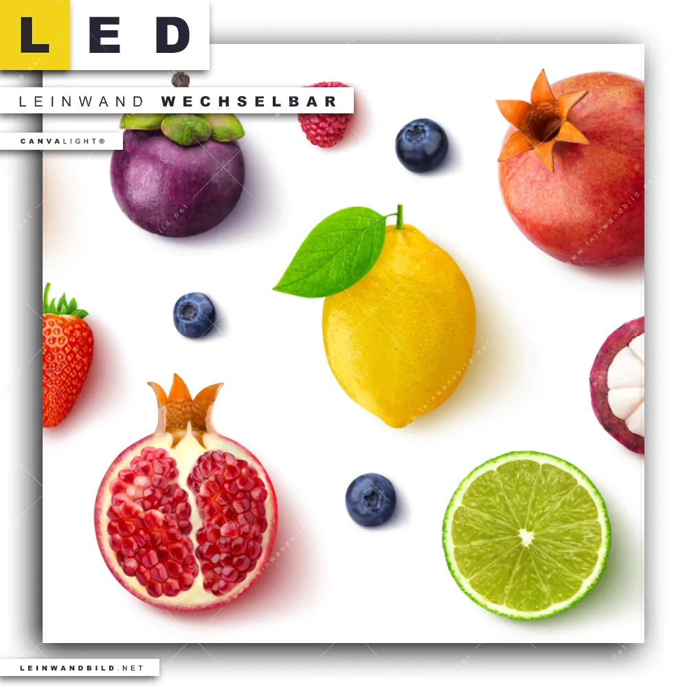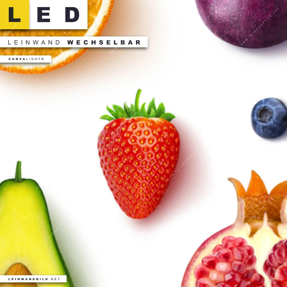 Du bist auf der Suche nach einem Essen - Trinken LED Leinwandbild im Quadratischen Format? Begriffe wie Obst, Zitrusfrüchte, Früchte, Kiwi, frisch, spritzig, Ananas, Spritzer, Tropfen, Orange, Apfel, Zitrone, Granadapfel, Blaubeere haben Dich auf der Suche nach Deinem neuen XXL LED Wandbild mit wechselbarer Leinwand inspiriert? Farben wie Bunt, Weiss, Blau, Grün, Mint, Orange, Rot, Rosa dürfen auf Deinem neuen Leinwand-LED-Bild nicht fehlen und Leuchtbilder im Mixed Media, Modern Art Stil passen perfekt zu Deinem Einrichtungsstil?
