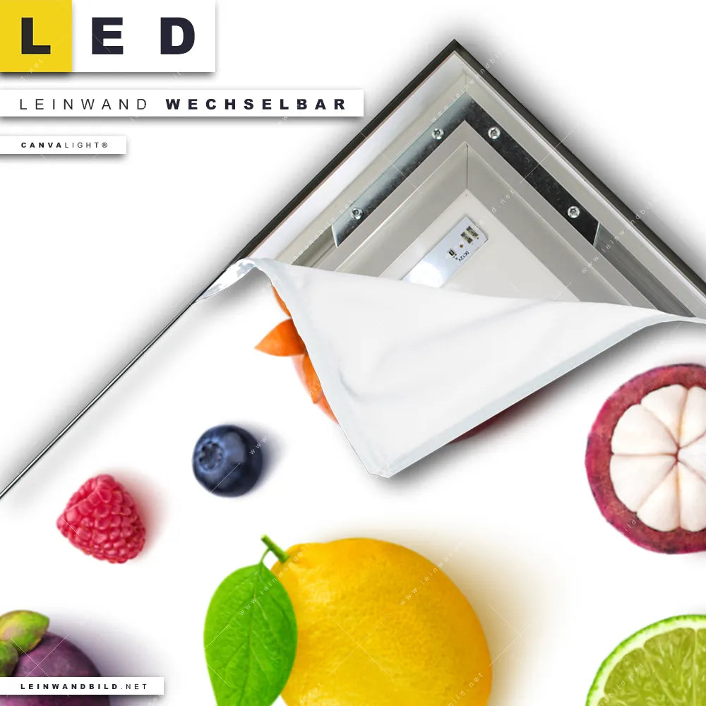 Du konfigurierst Dein individuelles LED Leinwandbild Canvalight® TEX | Exotische Früchte | Querformat und wir produzieren es NEU für Dich. Unsere Essen - Trinken LED Bilder mit wechselbarer Textil-Leinwand sind KEINE Lagerware. Du bist Dir unsicher, welches Motiv oder Format das richtige für dein individuelles Canvalight® Leuchtbild ist, dann helfen wir dir gerne weiter und beraten dich!