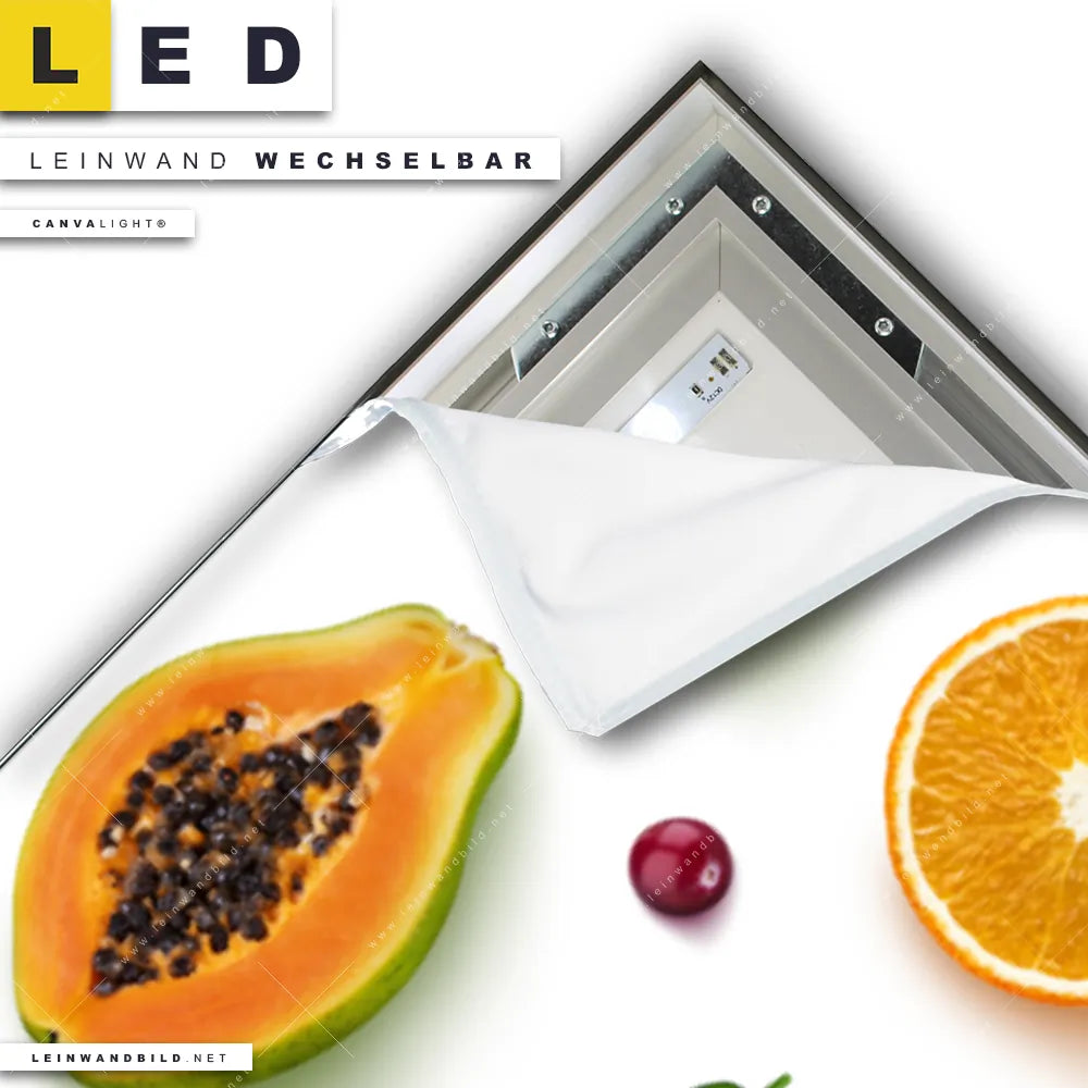 Du konfigurierst Dein individuelles LED Leinwandbild Canvalight® TEX | Exotische Früchte | Schmal und wir produzieren es NEU für Dich. Unsere Essen - Trinken LED Bilder mit wechselbarer Textil-Leinwand sind KEINE Lagerware. Du bist Dir unsicher, welches Motiv oder Format das richtige für dein individuelles Canvalight® Leuchtbild ist, dann helfen wir dir gerne weiter und beraten dich!