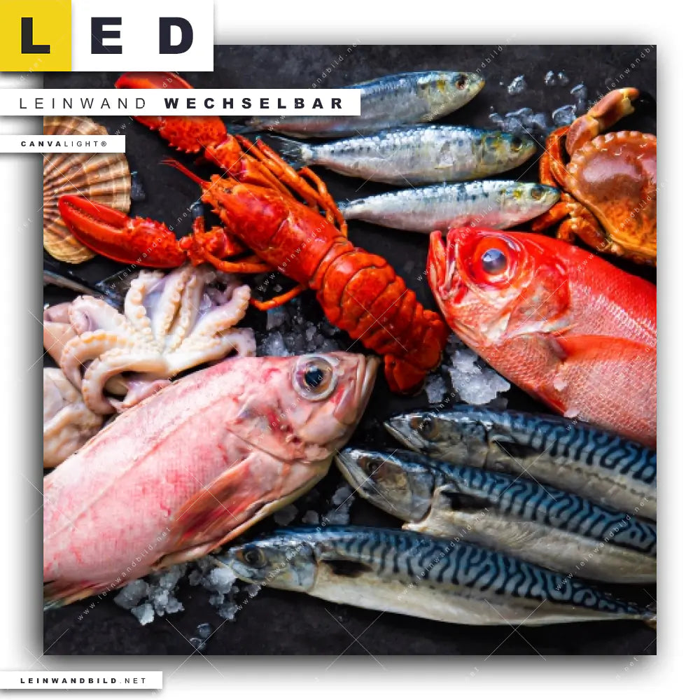 Dann sollte das LED Leinwandbild Canvalight® TEX | Frischer Fisch und Meeresfrüchte | Quadrat den Weg zu Dir finden. Das stufenlos dimmbare Leinwandbild Genuss aus dem Meer im steckerfertigen Leuchtrahmen mit Fernbedienung und optionaler Farbtemperatursteuerung fügt sich als Eye-Catcher harmonisch in jedes Bar - Gastronomie, Küche - Esszimmer Raumkonzept ein.