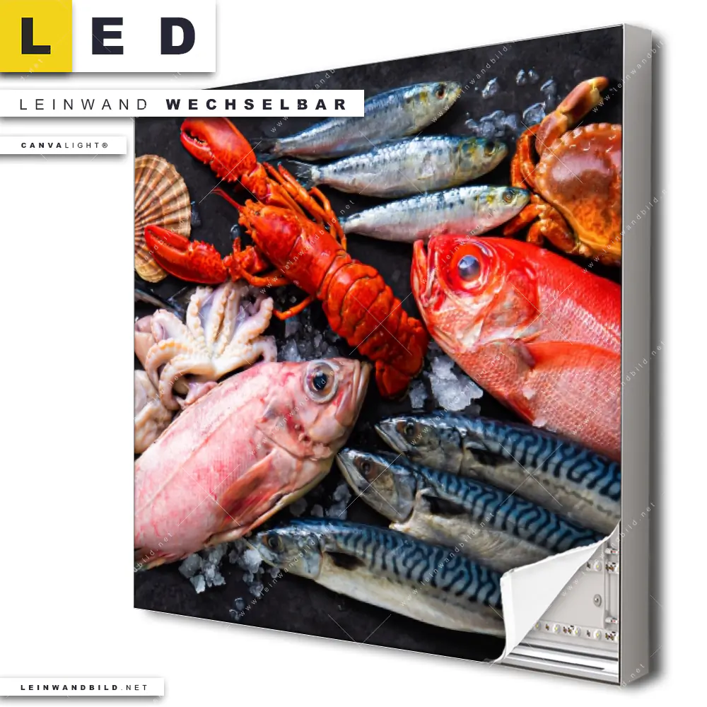 LED Leinwandbild Canvalight® TEX | Frischer Fisch und Meeresfrüchte | Quadrat
