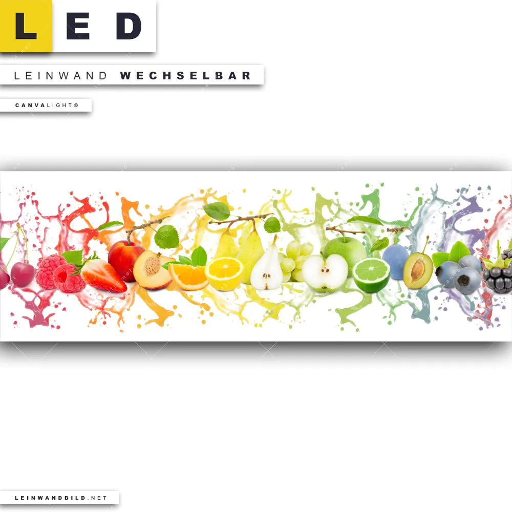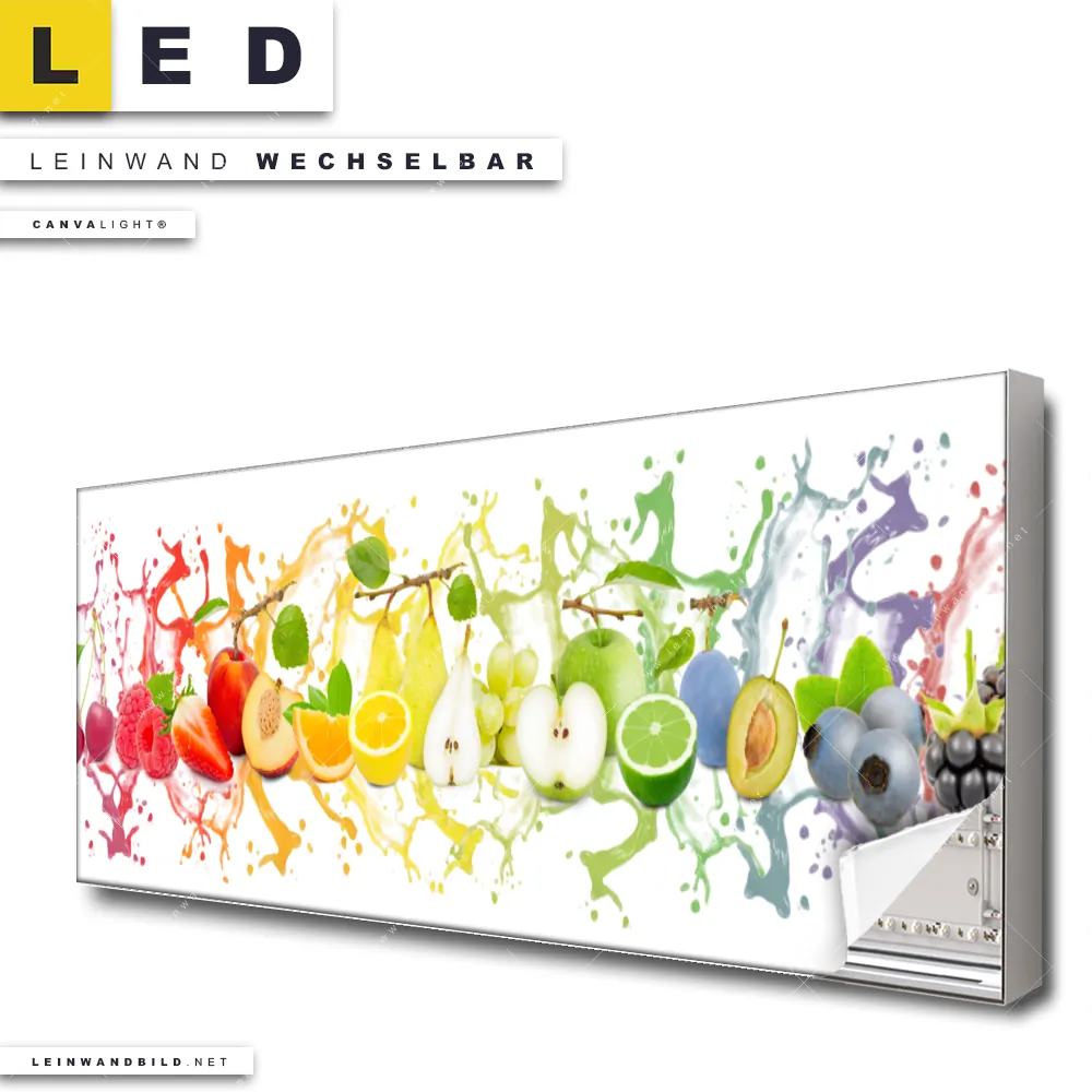 Dann sollte das LED Leinwandbild Canvalight® TEX | Fruchtspritzer | Panorama den Weg zu Dir finden. Das stufenlos dimmbare Leinwandbild bunte Früchte mit Spritzern im steckerfertigen Leuchtrahmen mit Fernbedienung und optionaler Farbtemperatursteuerung fügt sich als Eye-Catcher harmonisch in jedes Bar - Gastronomie, Küche - Esszimmer Raumkonzept ein.