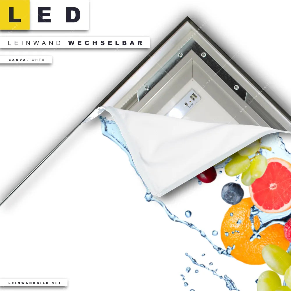 Du konfigurierst Dein individuelles LED Leinwandbild Canvalight® TEX | Früchte in Spritzwasser | Hochformat und wir produzieren es NEU für Dich. Unsere Essen - Trinken LED Bilder mit wechselbarer Textil-Leinwand sind KEINE Lagerware. Du bist Dir unsicher, welches Motiv oder Format das richtige für dein individuelles Canvalight® Leuchtbild ist, dann helfen wir dir gerne weiter und beraten dich!
