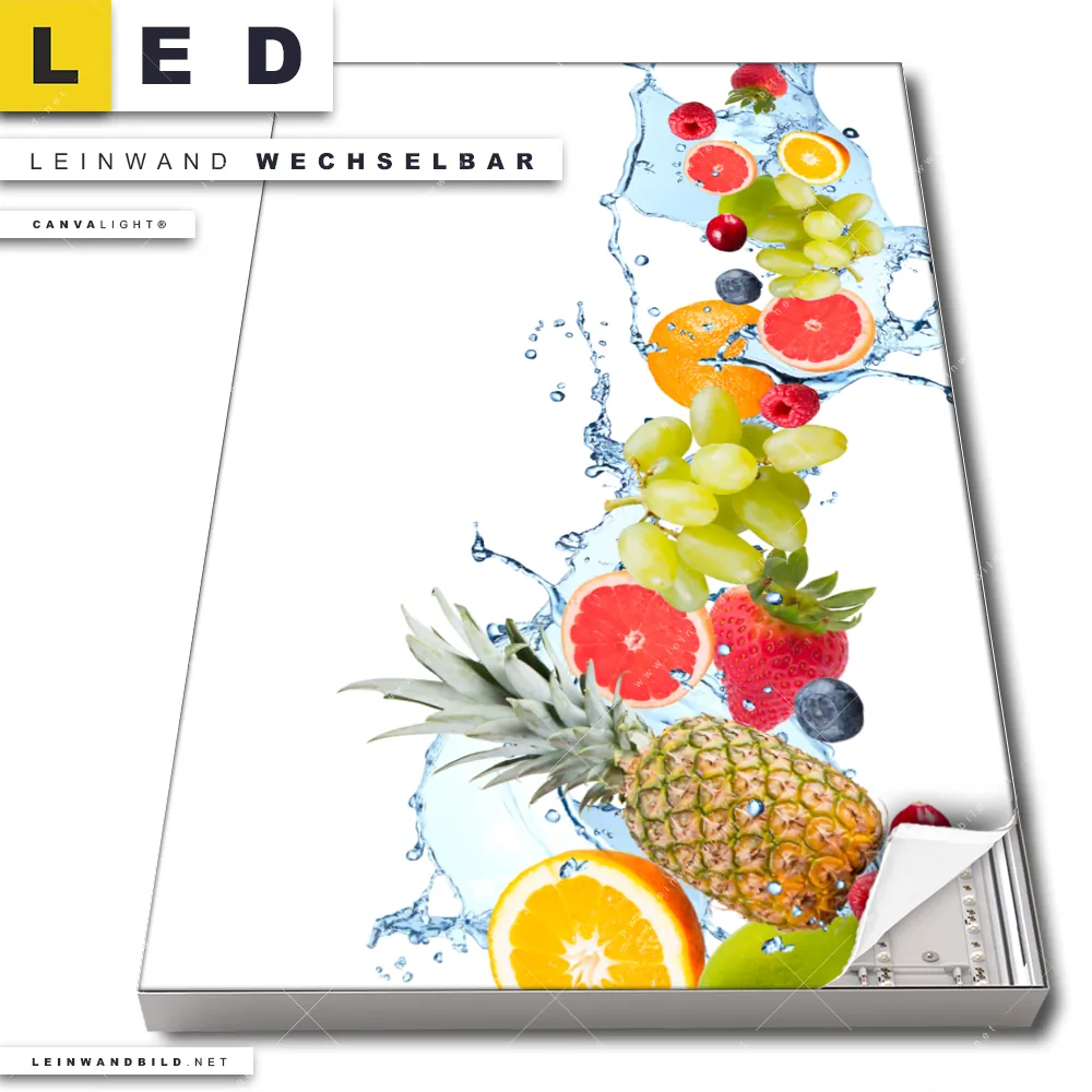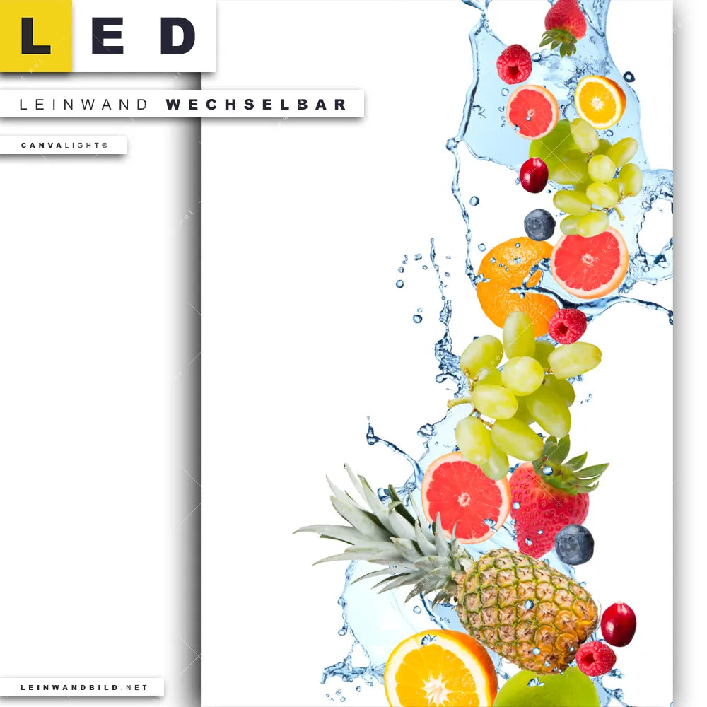 LED Leinwandbild Canvalight® TEX | Früchte in Spritzwasser | Hochformat