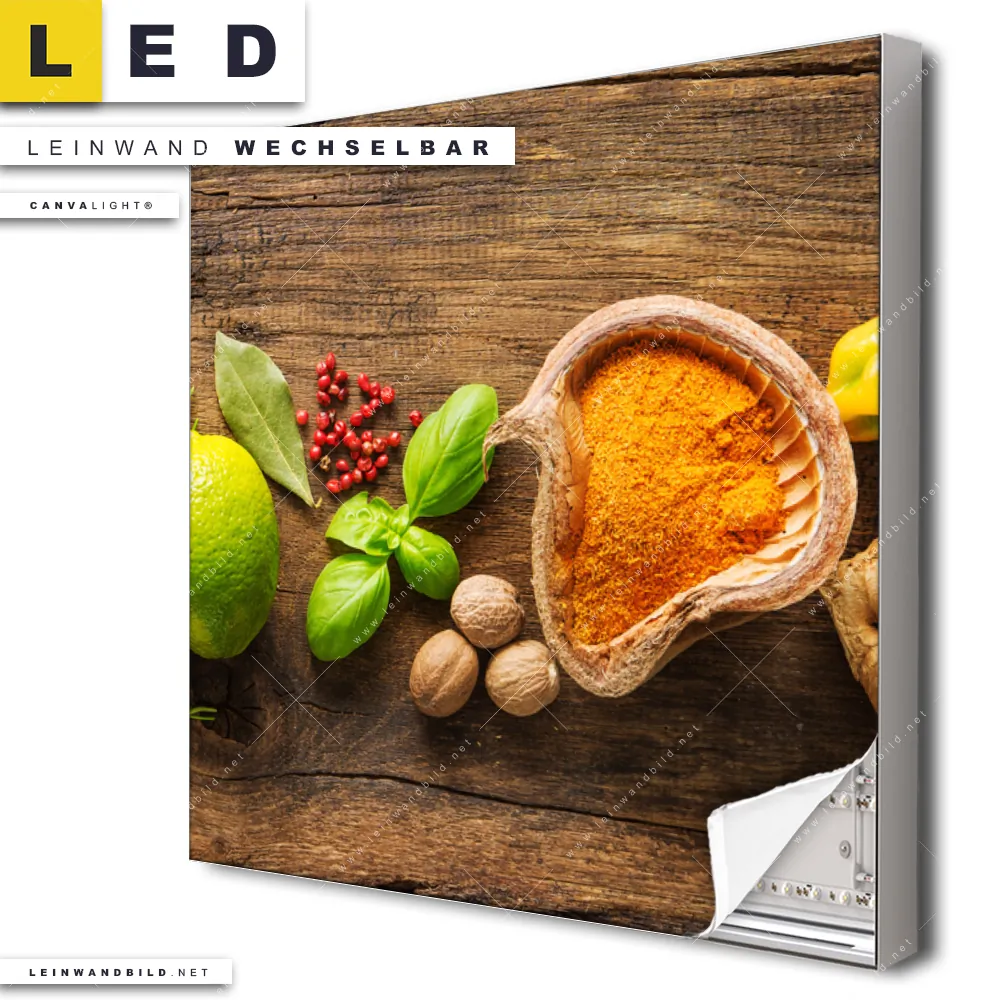 Du bist auf der Suche nach einem Essen - Trinken LED Leinwandbild im Quadratischen Format? Begriffe wie Gewürze, Kräuter, kochen, Chili, Pfeffer, Ingwer, Paprika, Holz, Knoblauch, Essen, Küche haben Dich auf der Suche nach Deinem neuen XXL LED Wandbild mit wechselbarer Leinwand inspiriert? Farben wie Braun, Rot, Grün dürfen auf Deinem neuen Leinwand-LED-Bild nicht fehlen und Leuchtbilder im Modern Art, Natürlich - Realistisch Stil passen perfekt zu Deinem Einrichtungsstil?