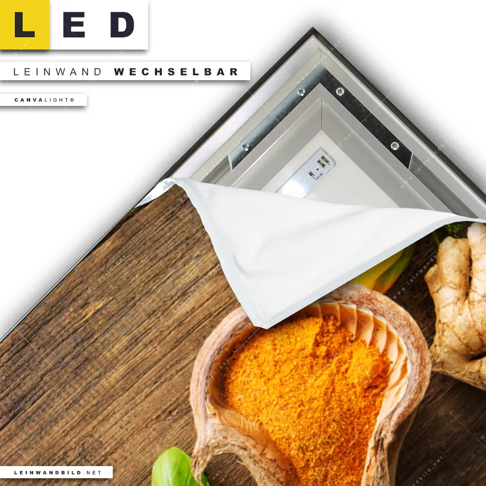 Du konfigurierst Dein individuelles LED Leinwandbild Canvalight® TEX | Gewürze & Kräuter auf Holz | Querformat und wir produzieren es NEU für Dich. Unsere Essen - Trinken LED Bilder mit wechselbarer Textil-Leinwand sind KEINE Lagerware. Du bist Dir unsicher, welches Motiv oder Format das richtige für dein individuelles Canvalight® Leuchtbild ist, dann helfen wir dir gerne weiter und beraten dich!