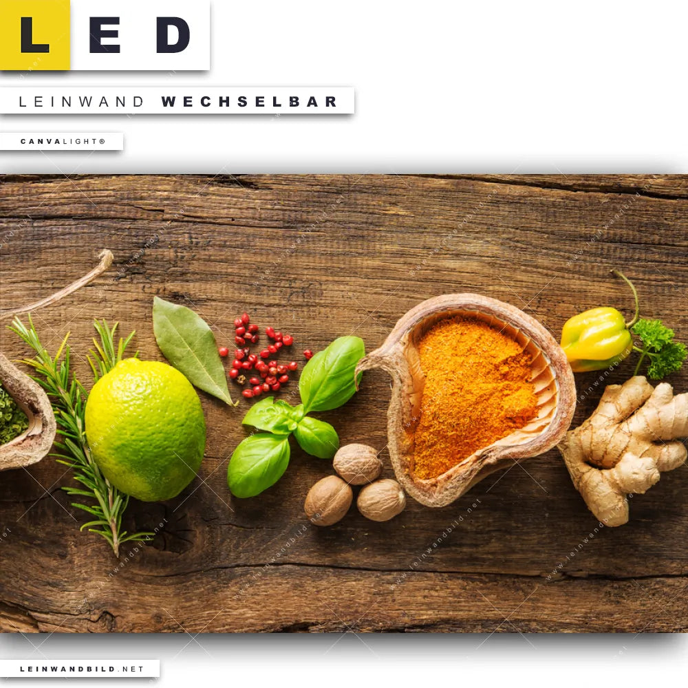 Du bist auf der Suche nach einem Essen - Trinken LED Leinwandbild im Querformat? Begriffe wie Gewürze, Kräuter, kochen, Chili, Pfeffer, Ingwer, Paprika, Holz, Knoblauch, Essen, Küche haben Dich auf der Suche nach Deinem neuen XXL LED Wandbild mit wechselbarer Leinwand inspiriert? Farben wie Braun, Rot, Grün dürfen auf Deinem neuen breiten Leinwand-LED-Bild nicht fehlen und Leuchtbilder im Modern Art, Natürlich - Realistisch Stil passen perfekt zu Deinem Einrichtungsstil?
