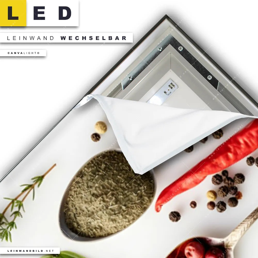 Du konfigurierst Dein individuelles LED Leinwandbild Canvalight® TEX | Gewürzvielfalt | Schmal und wir produzieren es NEU für Dich. Unsere Essen - Trinken LED Bilder mit wechselbarer Textil-Leinwand sind KEINE Lagerware. Du bist Dir unsicher, welches Motiv oder Format das richtige für dein individuelles Canvalight® Leuchtbild ist, dann helfen wir dir gerne weiter und beraten dich!