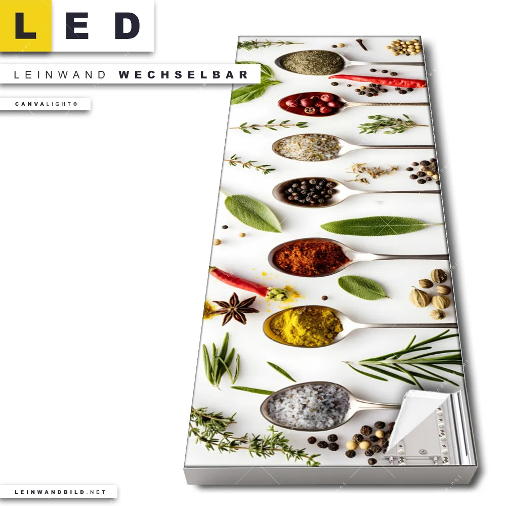 Du bist auf der Suche nach einem Essen - Trinken LED Leinwandbild im Schmalen Format? Begriffe wie Gewürze, Kräuter, Löffel, Besteck, Lebensmittel, Geschmack, kochen, Aromen haben Dich auf der Suche nach Deinem neuen XXL LED Wandbild mit wechselbarer Leinwand inspiriert? Farben wie Weiss, Silber, Grün dürfen auf Deinem neuen Leinwand-LED-Bild im Panorama-Hochformat nicht fehlen und Leuchtbilder im Natürlich - Realistisch Stil passen perfekt zu Deinem Einrichtungsstil?