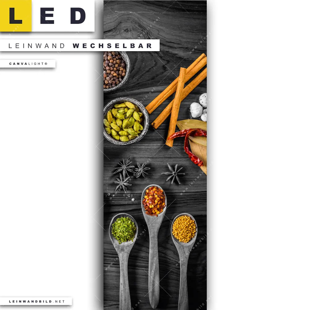Du bist auf der Suche nach einem Essen - Trinken LED Leinwandbild im Schmalen Format? Begriffe wie Kräuter, Gewürze, Löffel, Besteck, kochen, Lebensmittel, Pulver, Körner haben Dich auf der Suche nach Deinem neuen XXL LED Wandbild mit wechselbarer Leinwand inspiriert? Farben wie Grün, Schwarz, Braun, Beige dürfen auf Deinem neuen Leinwand-LED-Bild im Panorama-Hochformat nicht fehlen und Leuchtbilder im Natürlich - Realistisch, Modern Art Stil passen perfekt zu Deinem Einrichtungsstil?